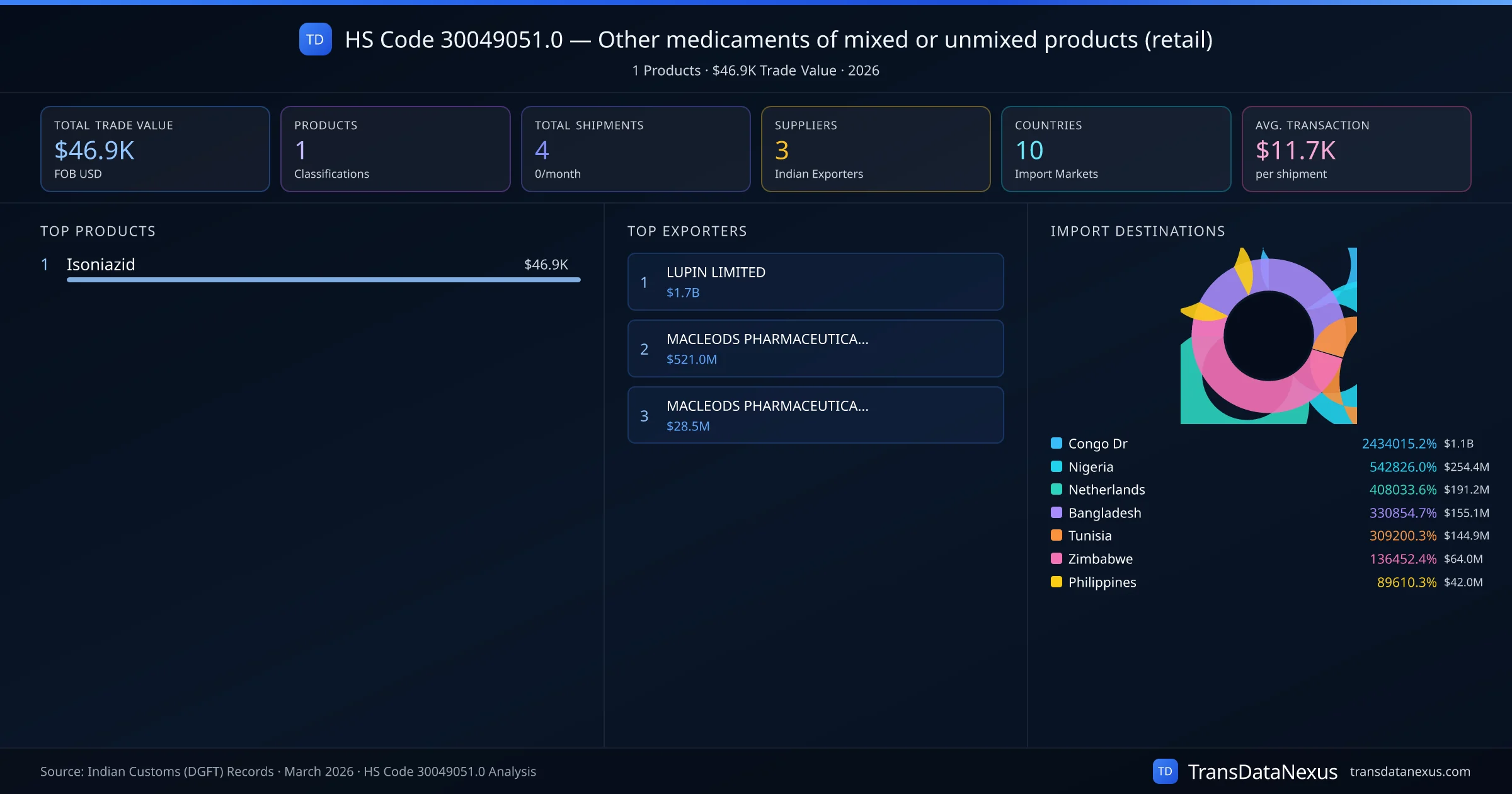 The top importing markets include Congo Dr, Nigeria, Netherlands. The top 5 products account for 100.0% of total trade under this code. Average transaction value is $11.7K. Leading exporters include LUPIN LIMITED and MACLEODS PHARMACEUTICALS LTD. Data sourced from Indian Customs (DGFT) shipping bill records.