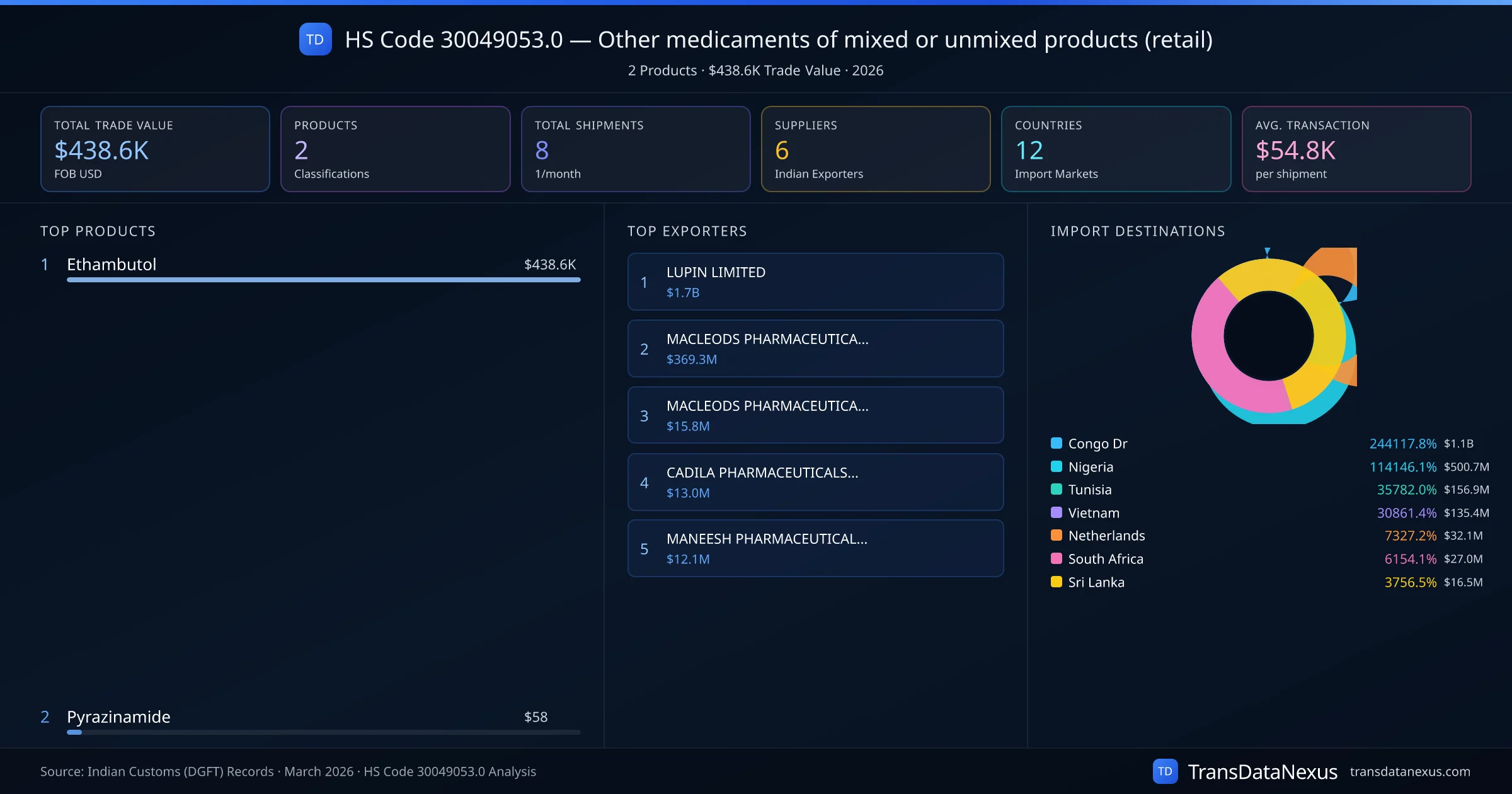 HS Code 30049053.0 (Other medicaments of mixed or unmixed products (retail)) is one of India's most significant pharmaceutical export classifications under Chapter 30 of the Harmonized System. With a total trade value of $438.6K across 8 shipments, this code covers 2 distinct pharmaceutical products exported by 6 Indian manufacturers to 12 countries. The leading product under this classification is Ethambutol at $438.6K, followed by Pyrazinamide.