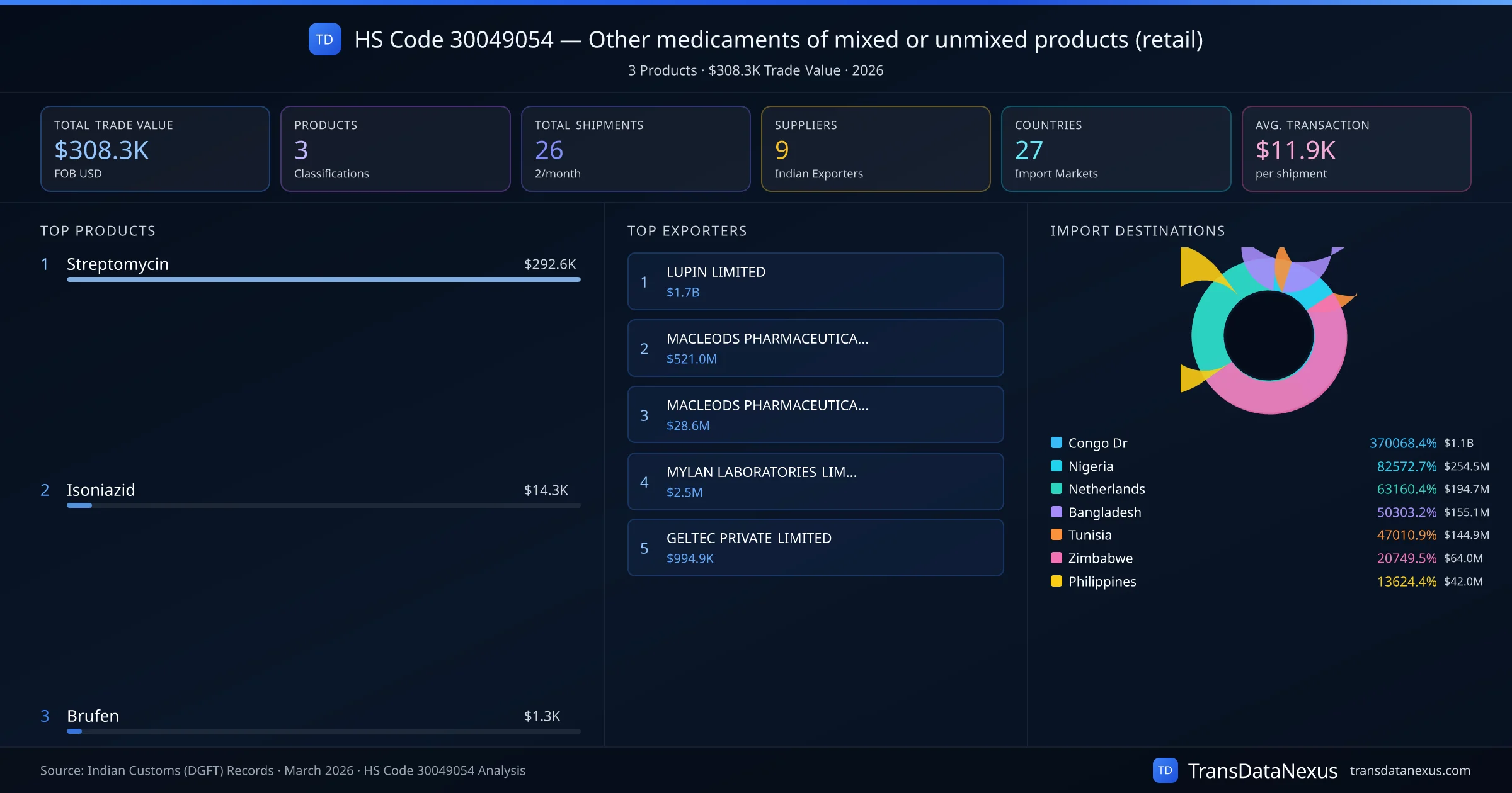HS Code 30049054 (Other medicaments of mixed or unmixed products (retail)) is one of India's most significant pharmaceutical export classifications under Chapter 30 of the Harmonized System. With a total trade value of $308.3K across 26 shipments, this code covers 3 distinct pharmaceutical products exported by 9 Indian manufacturers to 27 countries. The leading product under this classification is Streptomycin at $292.6K, followed by Isoniazid and Brufen.