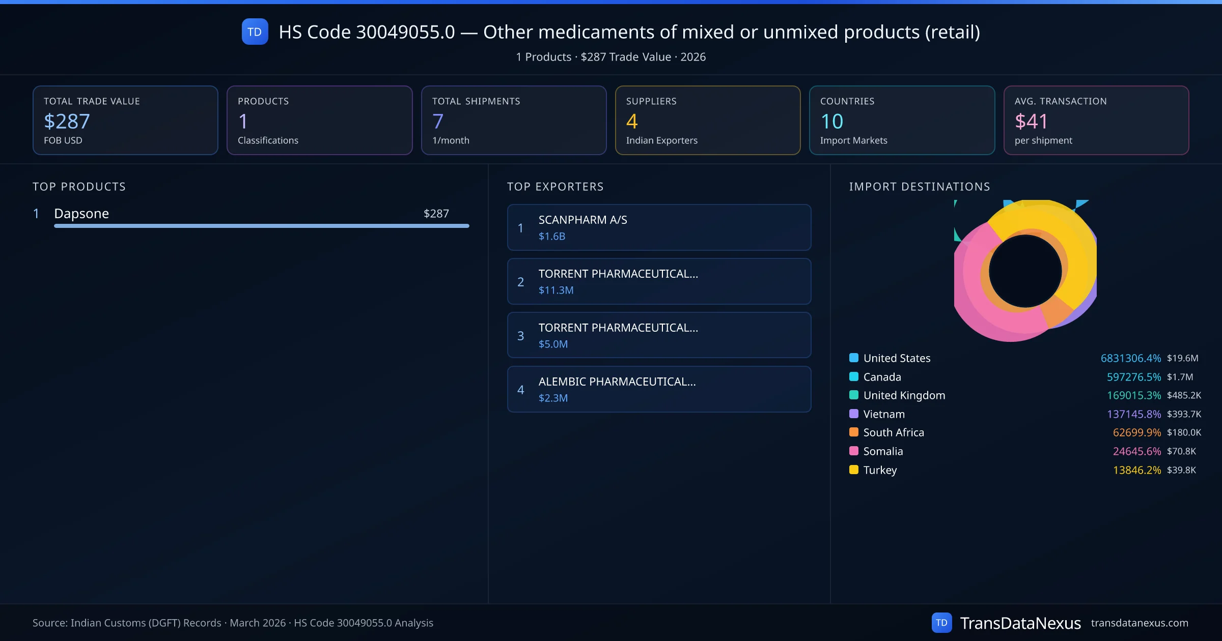 The top importing markets include United States, Canada, United Kingdom. The top 5 products account for 100.0% of total trade under this code. Average transaction value is $41. Leading exporters include SCANPHARM A/S and TORRENT PHARMACEUTICALS LTD. Data sourced from Indian Customs (DGFT) shipping bill records.