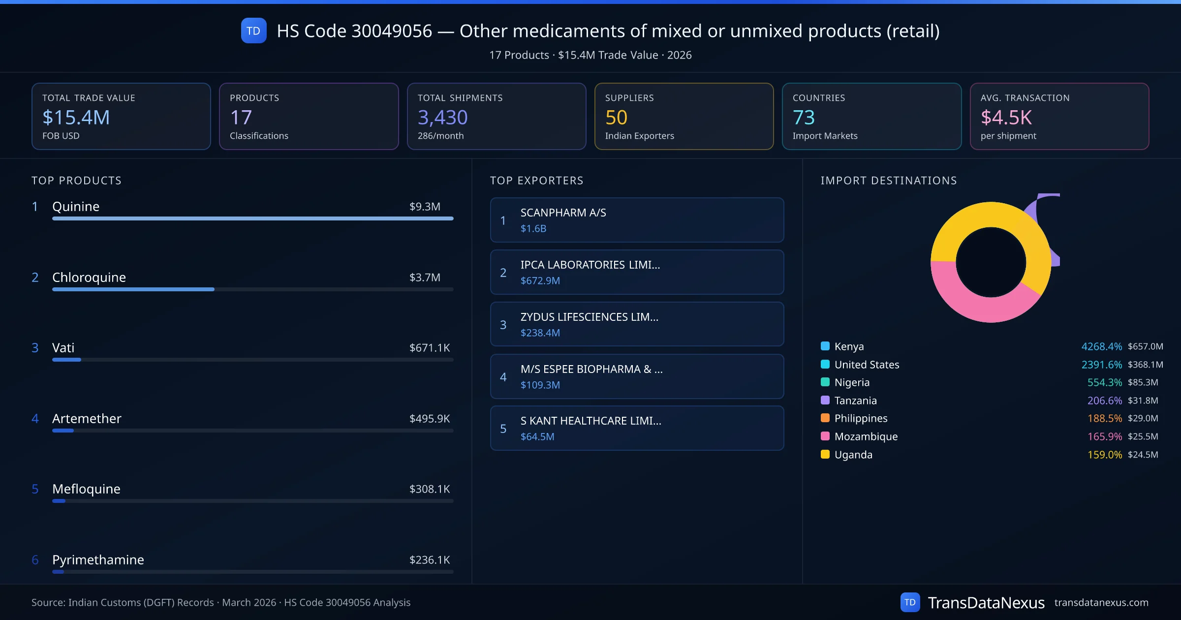 HS Code 30049056 (Other medicaments of mixed or unmixed products (retail)) is one of India's most significant pharmaceutical export classifications under Chapter 30 of the Harmonized System. With a total trade value of $15.4M across 3,430 shipments, this code covers 17 distinct pharmaceutical products exported by 50 Indian manufacturers to 73 countries. The leading product under this classification is Quinine at $9.3M, followed by Chloroquine and Vati.