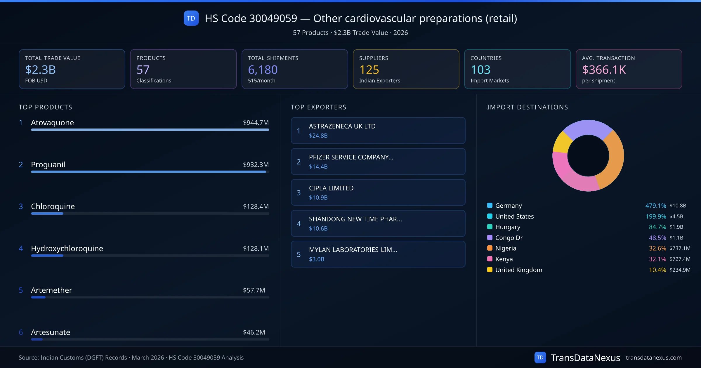 HS Code 30049059 (Other cardiovascular preparations (retail)) is one of India's most significant pharmaceutical export classifications under Chapter 30 of the Harmonized System. With a total trade value of $2.3B across 6,180 shipments, this code covers 57 distinct pharmaceutical products exported by 125 Indian manufacturers to 103 countries. The leading product under this classification is Atovaquone at $944.7M, followed by Proguanil and Chloroquine.