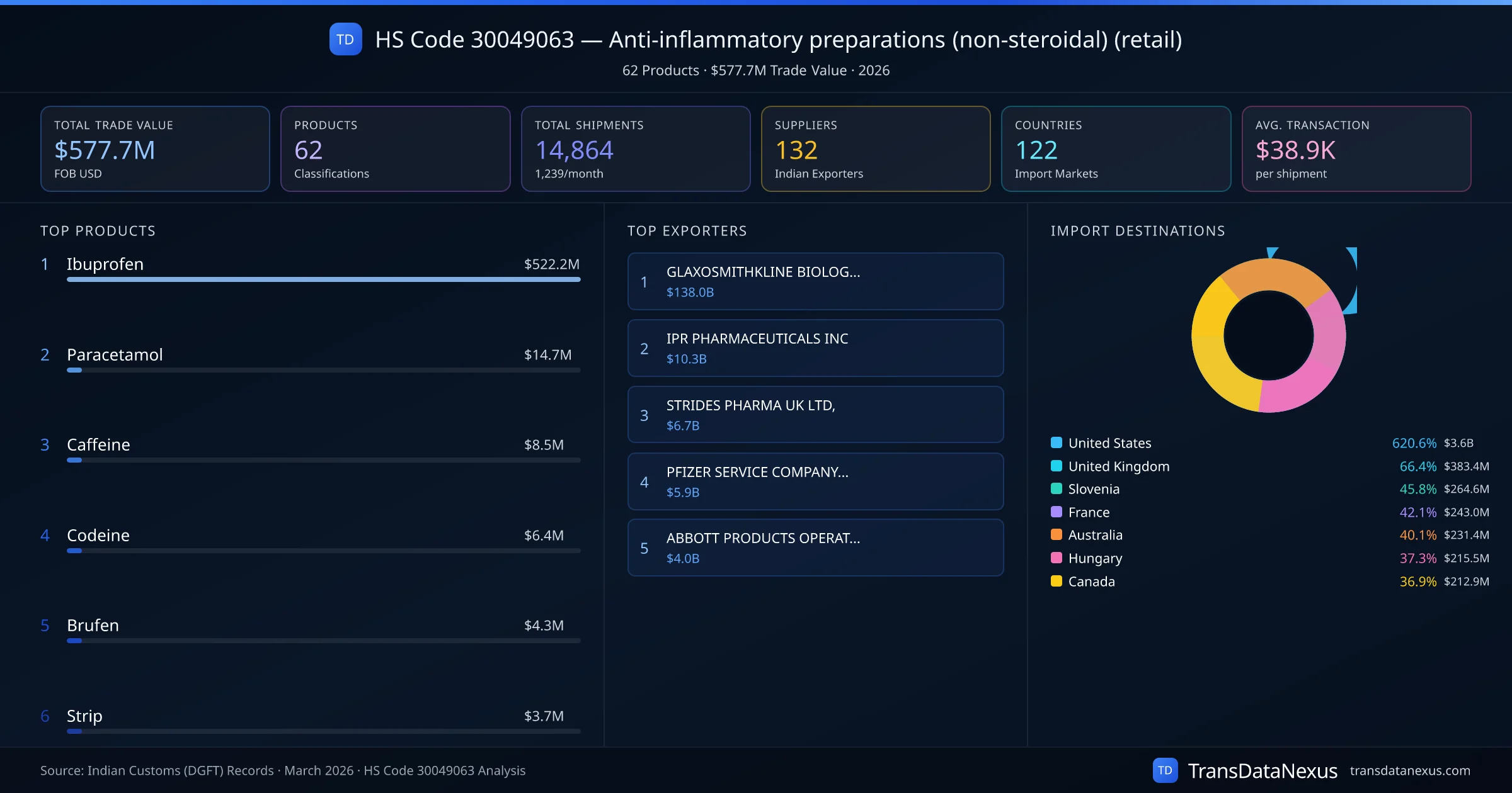 HS Code 30049063 (Anti-inflammatory preparations (non-steroidal) (retail)) is one of India's most significant pharmaceutical export classifications under Chapter 30 of the Harmonized System. With a total trade value of $577.7M across 14,864 shipments, this code covers 62 distinct pharmaceutical products exported by 132 Indian manufacturers to 122 countries. The leading product under this classification is Ibuprofen at $522.2M, followed by Paracetamol and Caffeine.