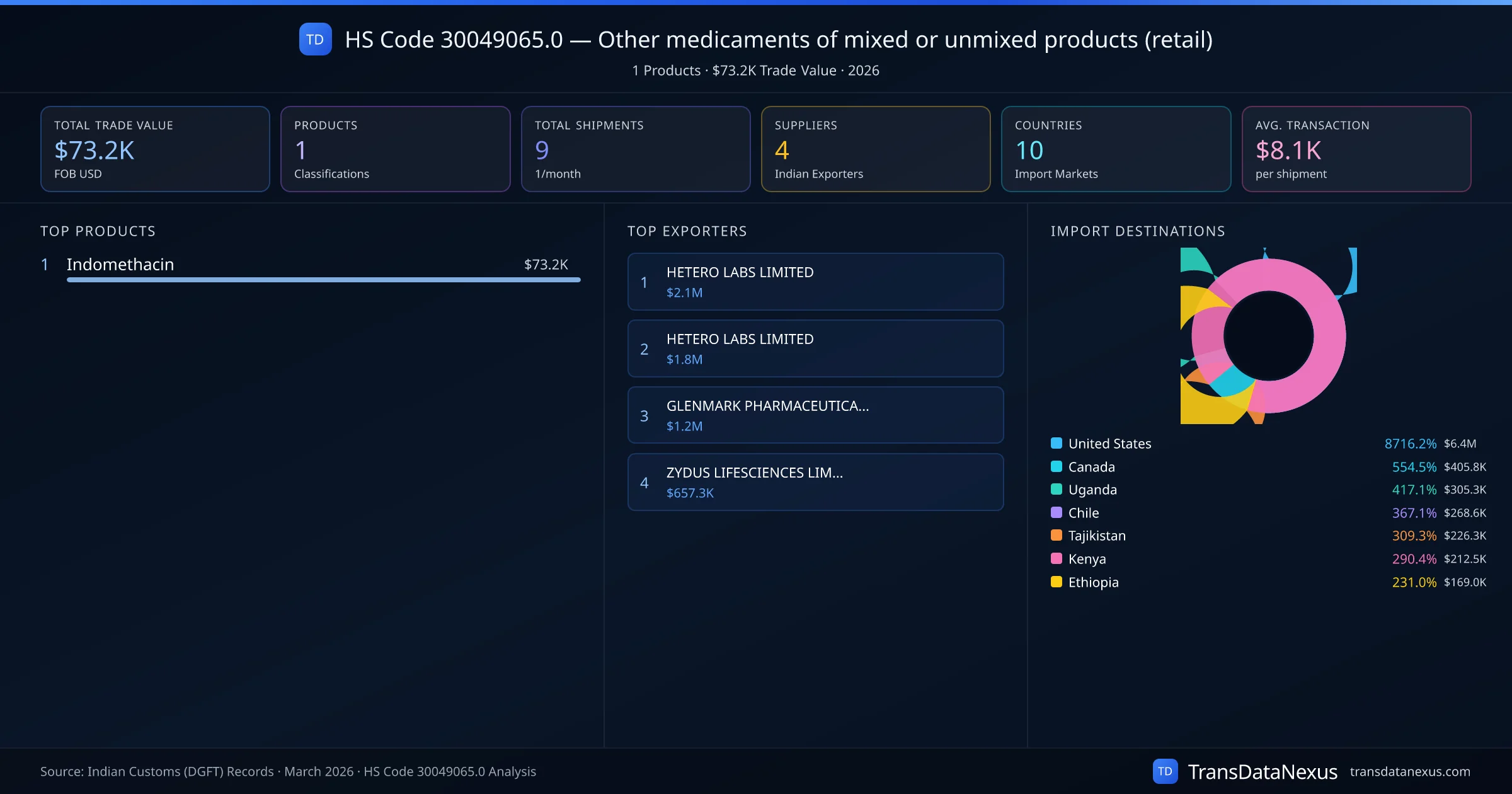 The top importing markets include United States, Canada, Uganda. The top 5 products account for 100.0% of total trade under this code. Average transaction value is $8.1K. Leading exporters include HETERO LABS LIMITED and HETERO LABS LIMITED. Data sourced from Indian Customs (DGFT) shipping bill records.