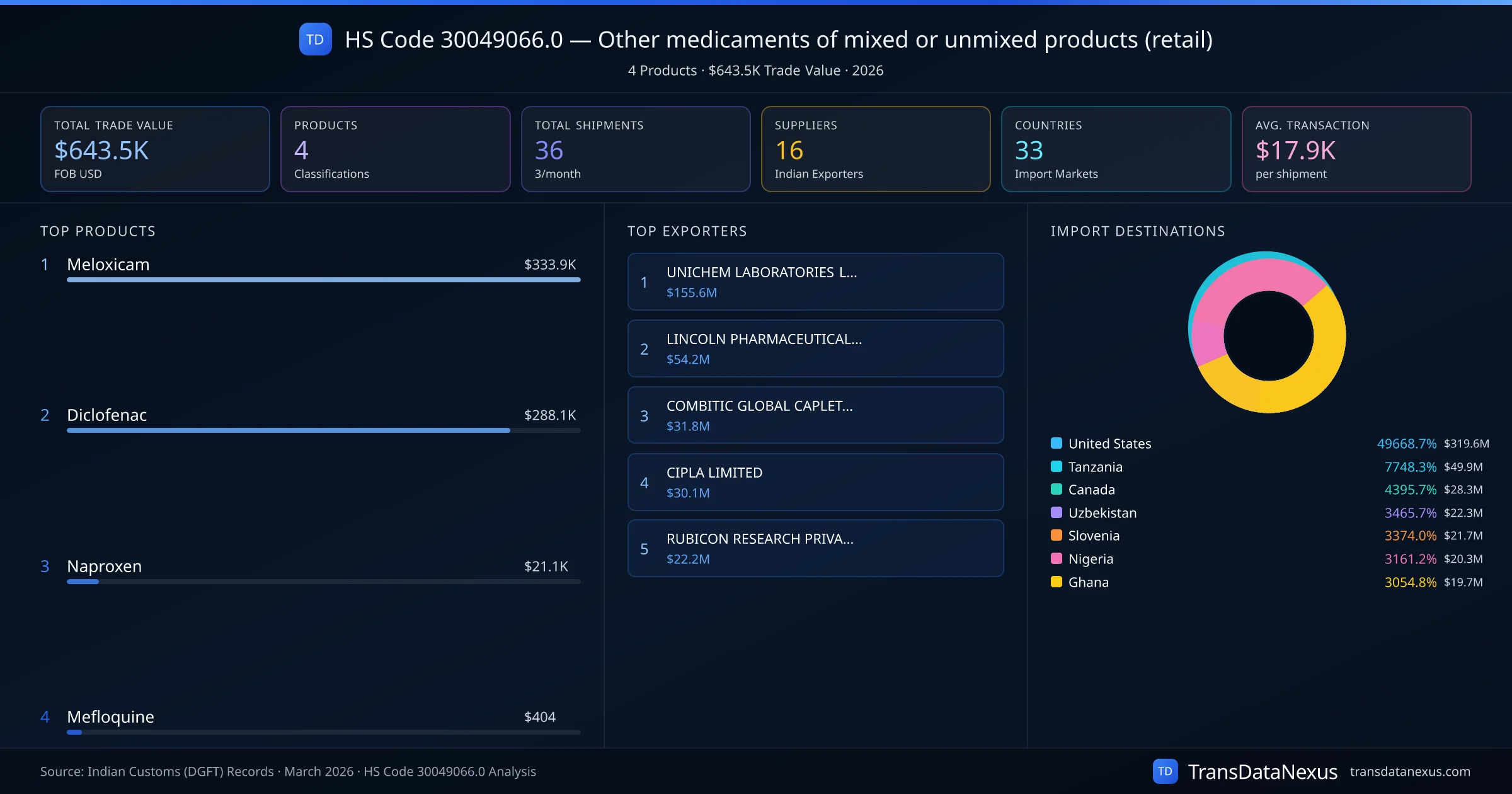 The top importing markets include United States, Tanzania, Canada. The top 5 products account for 100.0% of total trade under this code. Average transaction value is $17.9K. Leading exporters include UNICHEM LABORATORIES LIMITED and LINCOLN PHARMACEUTICALS LTD. Data sourced from Indian Customs (DGFT) shipping bill records.