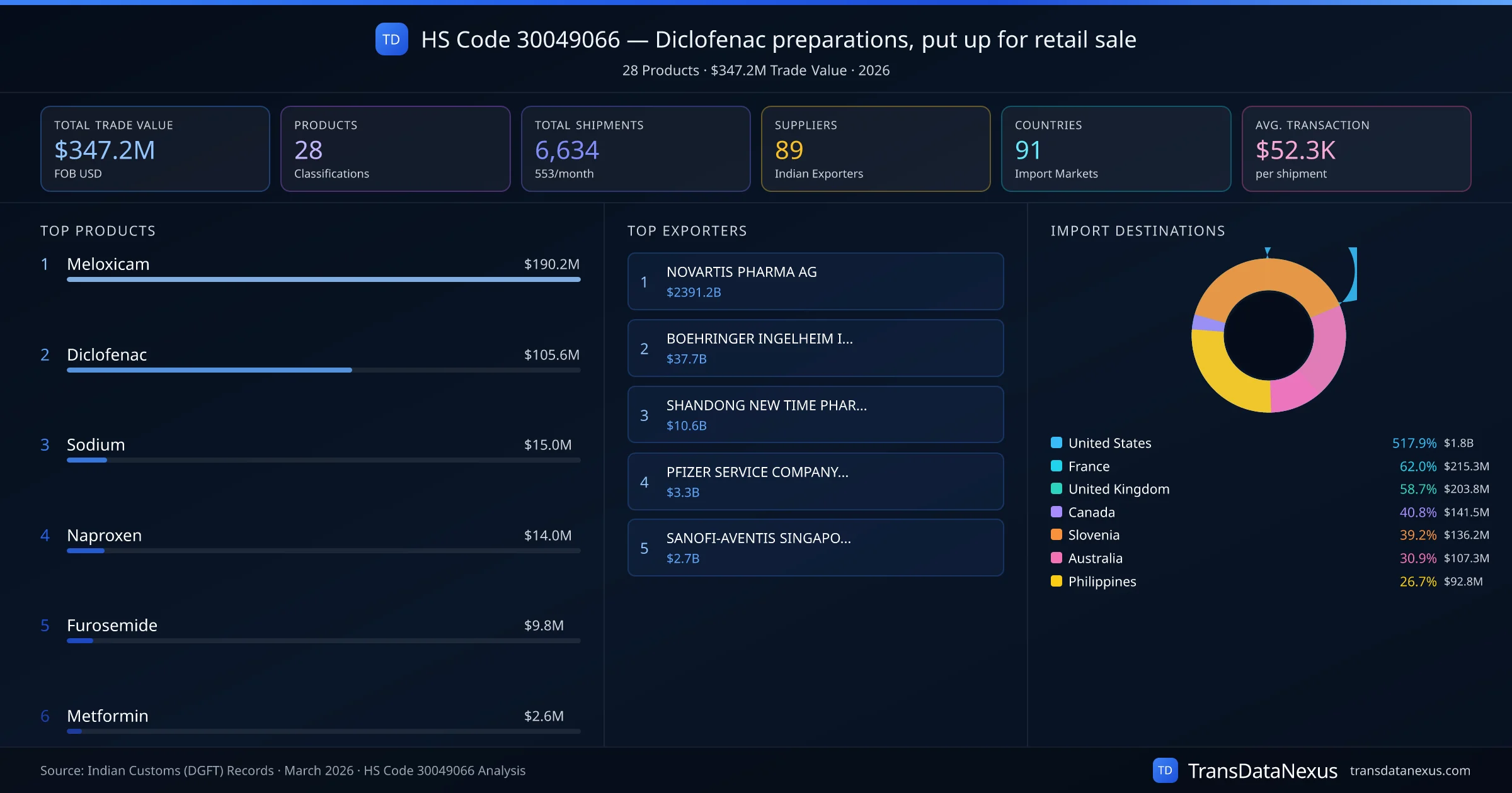 HS Code 30049066 (Diclofenac preparations, put up for retail sale) is one of India's most significant pharmaceutical export classifications under Chapter 30 of the Harmonized System. With a total trade value of $347.2M across 6,634 shipments, this code covers 28 distinct pharmaceutical products exported by 89 Indian manufacturers to 91 countries. The leading product under this classification is Meloxicam at $190.2M, followed by Diclofenac and Sodium.