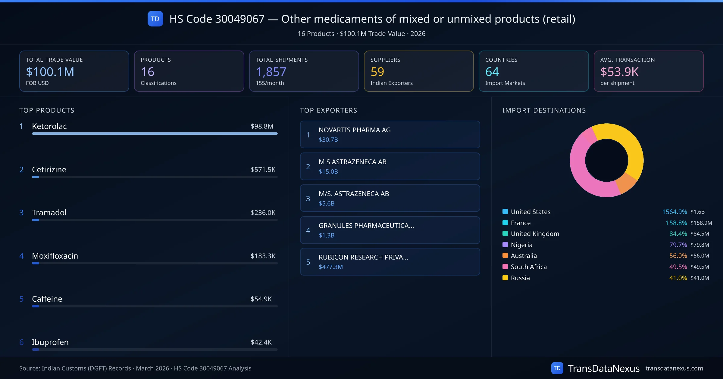 HS Code 30049067 (Other medicaments of mixed or unmixed products (retail)) is one of India's most significant pharmaceutical export classifications under Chapter 30 of the Harmonized System. With a total trade value of $100.1M across 1,857 shipments, this code covers 16 distinct pharmaceutical products exported by 59 Indian manufacturers to 64 countries. The leading product under this classification is Ketorolac at $98.8M, followed by Cetirizine and Tramadol.