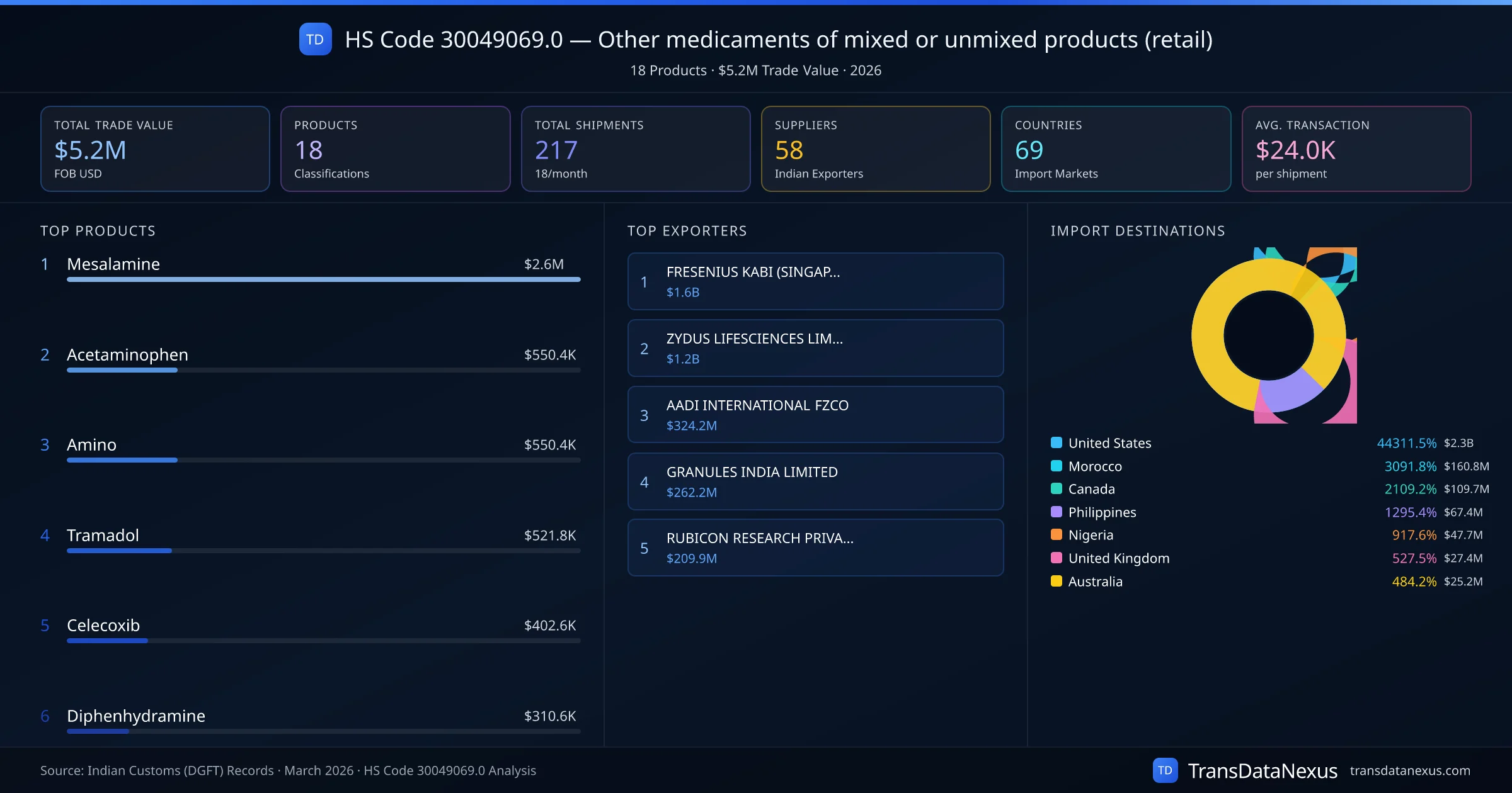 HS Code 30049069.0 (Other medicaments of mixed or unmixed products (retail)) is one of India's most significant pharmaceutical export classifications under Chapter 30 of the Harmonized System. With a total trade value of $5.2M across 217 shipments, this code covers 18 distinct pharmaceutical products exported by 58 Indian manufacturers to 69 countries. The leading product under this classification is Mesalamine at $2.6M, followed by Acetaminophen and Amino.