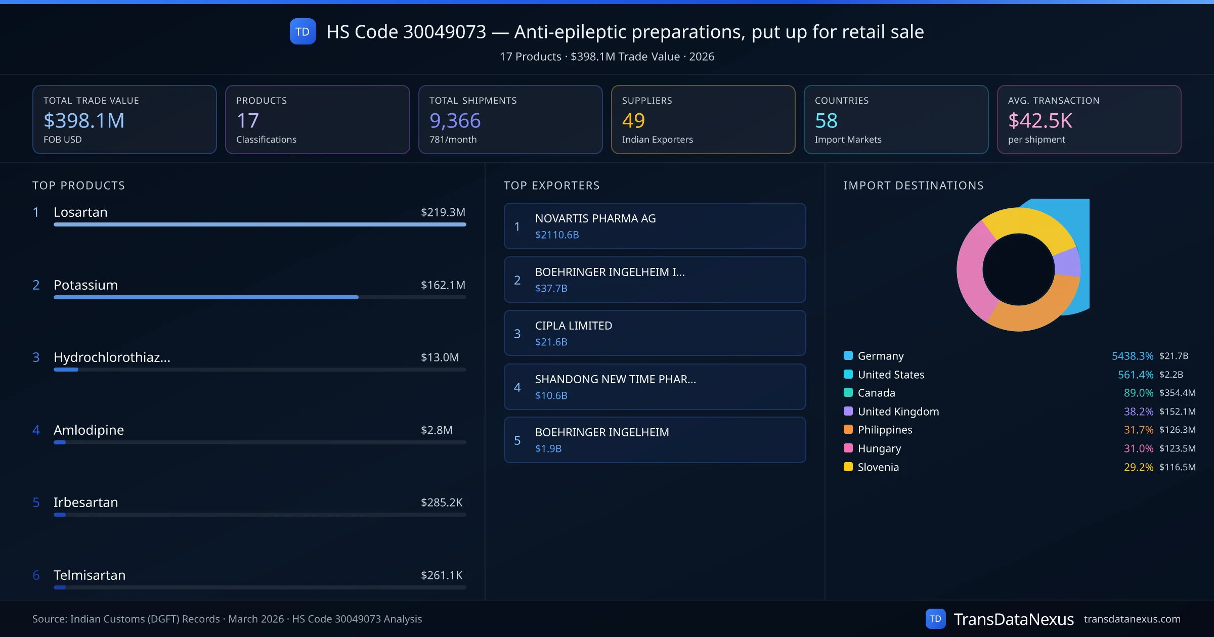 The top importing markets include Germany, United States, Canada. The top 5 products account for 99.8% of total trade under this code. Average transaction value is $42.5K. Leading exporters include NOVARTIS PHARMA AG and BOEHRINGER INGELHEIM INTERNATIONAL. Data sourced from Indian Customs (DGFT) shipping bill records.