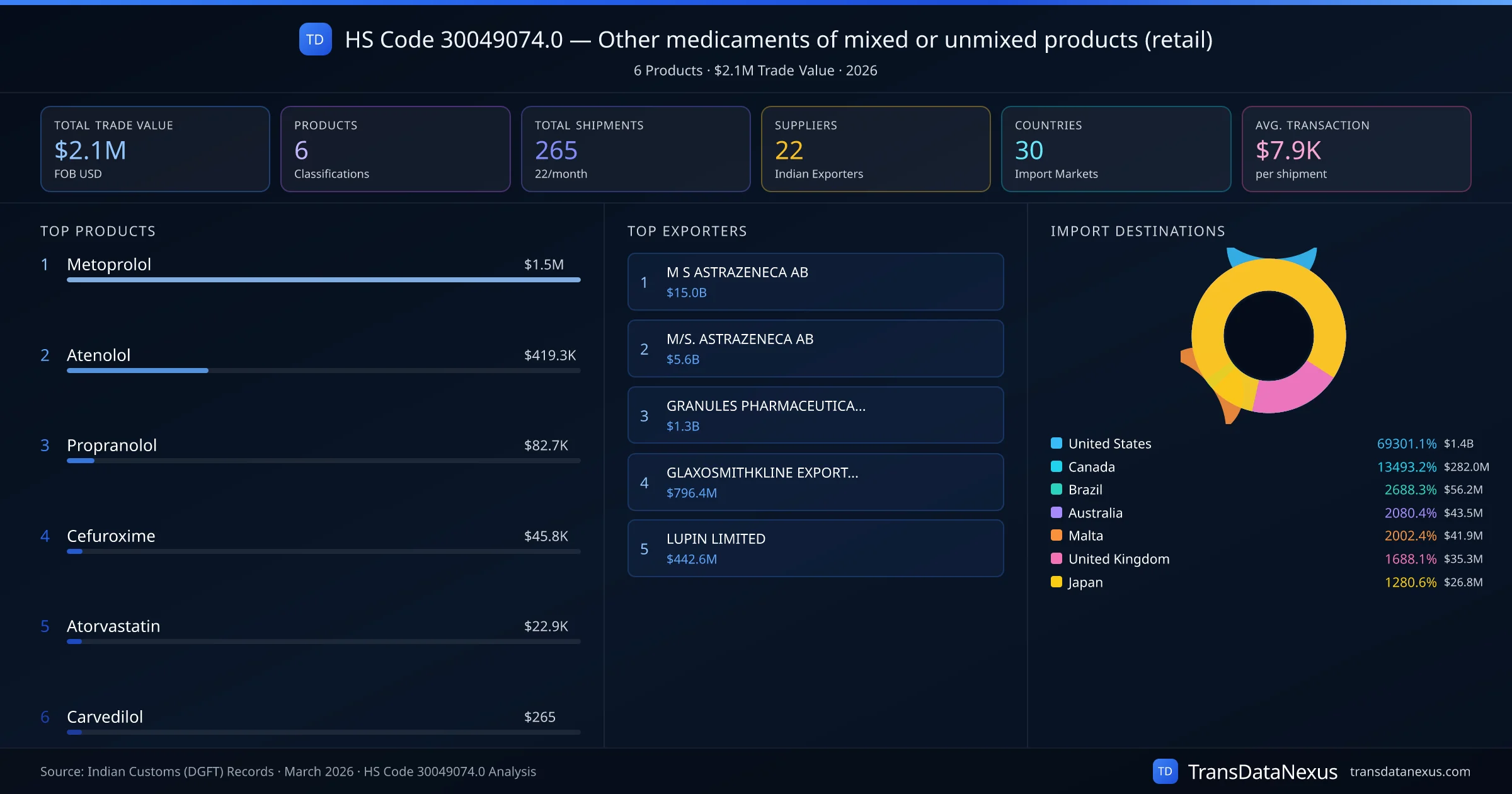 HS Code 30049074.0 (Other medicaments of mixed or unmixed products (retail)) is one of India's most significant pharmaceutical export classifications under Chapter 30 of the Harmonized System. With a total trade value of $2.1M across 265 shipments, this code covers 6 distinct pharmaceutical products exported by 22 Indian manufacturers to 30 countries. The leading product under this classification is Metoprolol at $1.5M, followed by Atenolol and Propranolol.