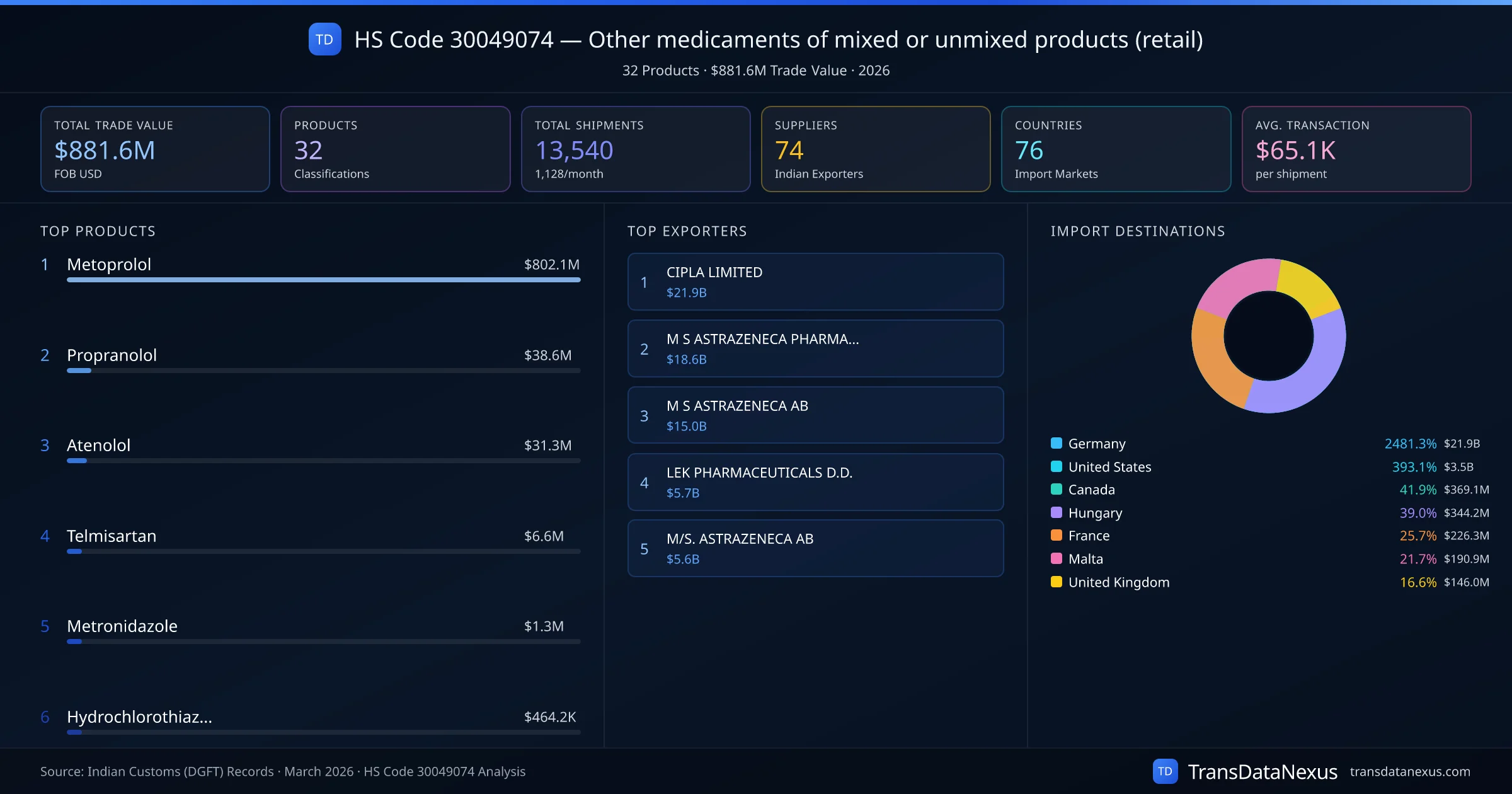 HS Code 30049074 (Other medicaments of mixed or unmixed products (retail)) is one of India's most significant pharmaceutical export classifications under Chapter 30 of the Harmonized System. With a total trade value of $881.6M across 13,540 shipments, this code covers 32 distinct pharmaceutical products exported by 74 Indian manufacturers to 76 countries. The leading product under this classification is Metoprolol at $802.1M, followed by Propranolol and Atenolol.