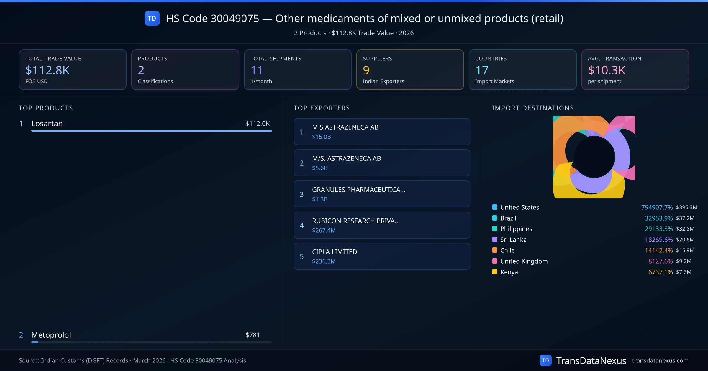 HS Code 30049075 (Other medicaments of mixed or unmixed products (retail)) is one of India's most significant pharmaceutical export classifications under Chapter 30 of the Harmonized System. With a total trade value of $112.8K across 11 shipments, this code covers 2 distinct pharmaceutical products exported by 9 Indian manufacturers to 17 countries. The leading product under this classification is Losartan at $112.0K, followed by Metoprolol.