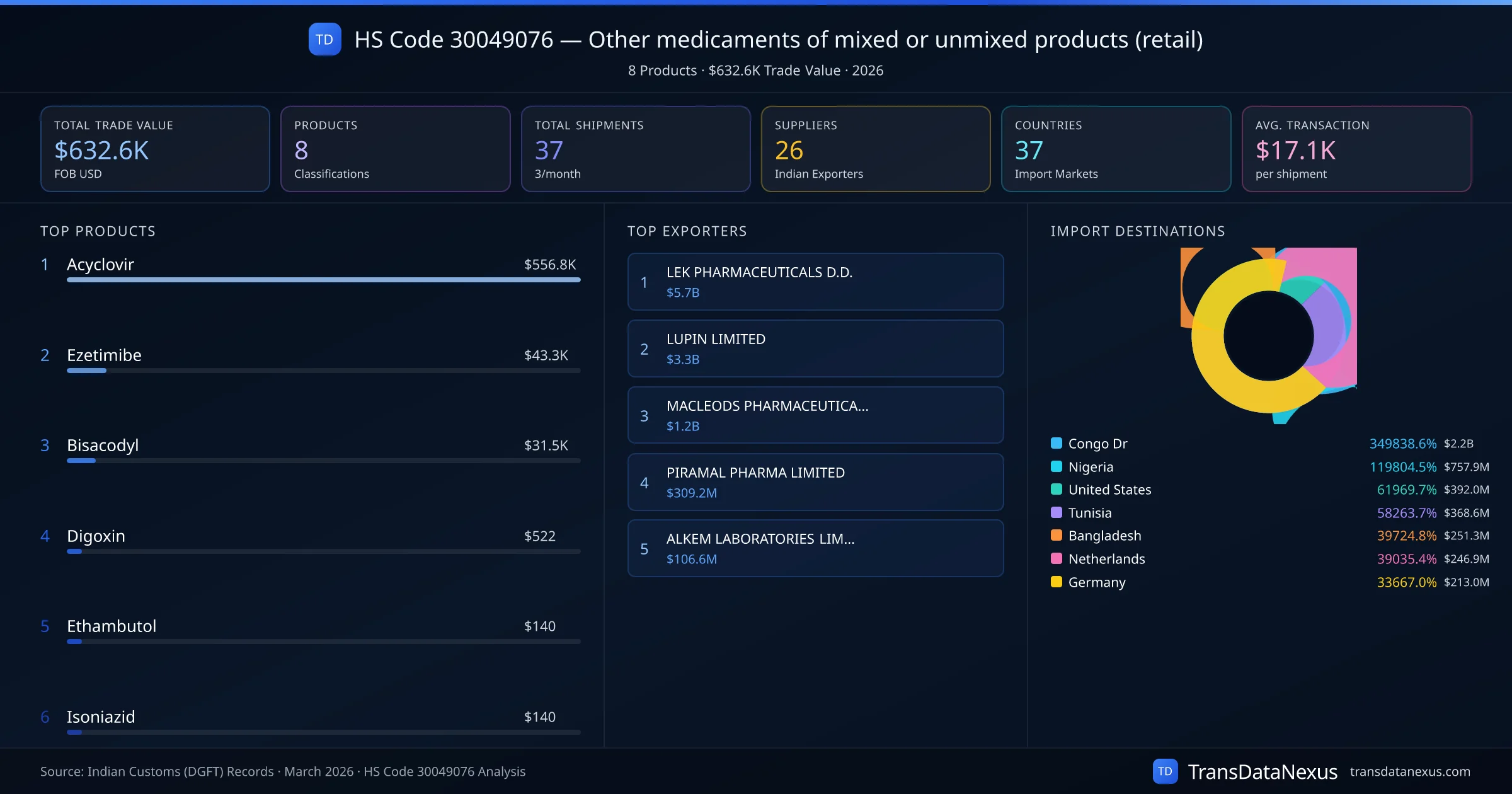 The top importing markets include Congo Dr, Nigeria, United States. The top 5 products account for 99.9% of total trade under this code. Average transaction value is $17.1K. Leading exporters include LEK PHARMACEUTICALS D.D. and LUPIN LIMITED. Data sourced from Indian Customs (DGFT) shipping bill records.
