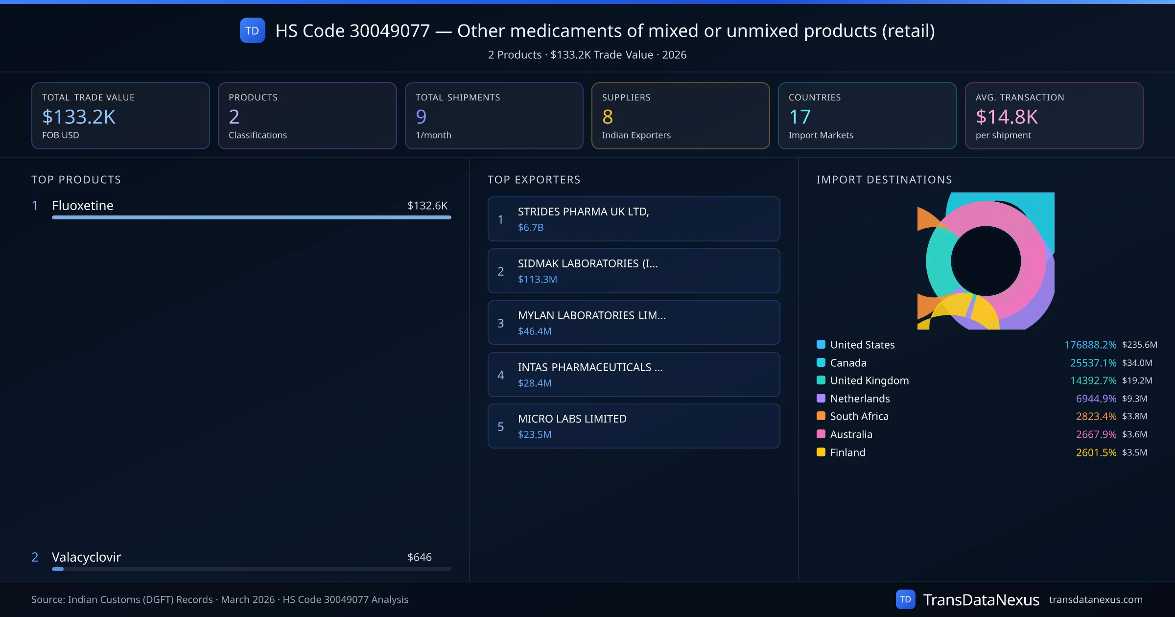 HS Code 30049077 (Other medicaments of mixed or unmixed products (retail)) is one of India's most significant pharmaceutical export classifications under Chapter 30 of the Harmonized System. With a total trade value of $133.2K across 9 shipments, this code covers 2 distinct pharmaceutical products exported by 8 Indian manufacturers to 17 countries. The leading product under this classification is Fluoxetine at $132.6K, followed by Valacyclovir.
