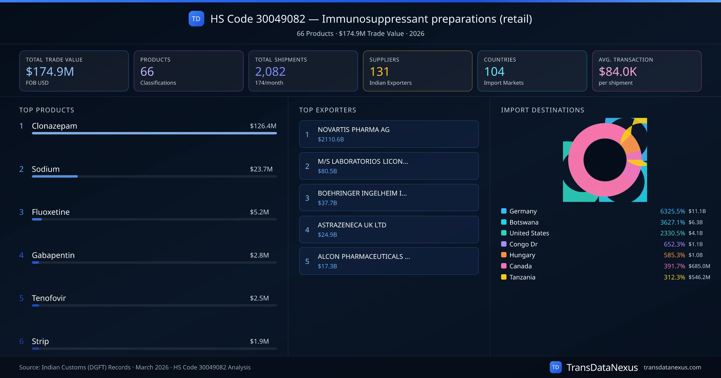 HS Code 30049082 (Immunosuppressant preparations (retail)) is one of India's most significant pharmaceutical export classifications under Chapter 30 of the Harmonized System. With a total trade value of $174.9M across 2,082 shipments, this code covers 66 distinct pharmaceutical products exported by 131 Indian manufacturers to 104 countries. The leading product under this classification is Clonazepam at $126.4M, followed by Sodium and Fluoxetine.