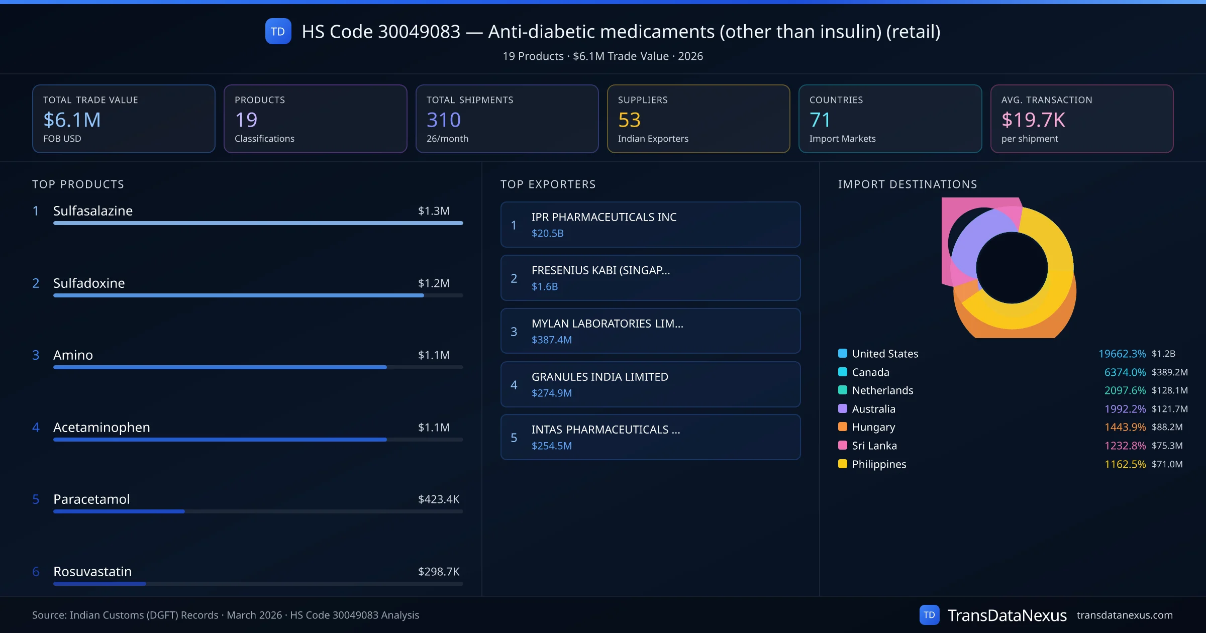 HS Code 30049083 (Anti-diabetic medicaments (other than insulin) (retail)) is one of India's most significant pharmaceutical export classifications under Chapter 30 of the Harmonized System. With a total trade value of $6.1M across 310 shipments, this code covers 19 distinct pharmaceutical products exported by 53 Indian manufacturers to 71 countries. The leading product under this classification is Sulfasalazine at $1.3M, followed by Sulfadoxine and Amino.