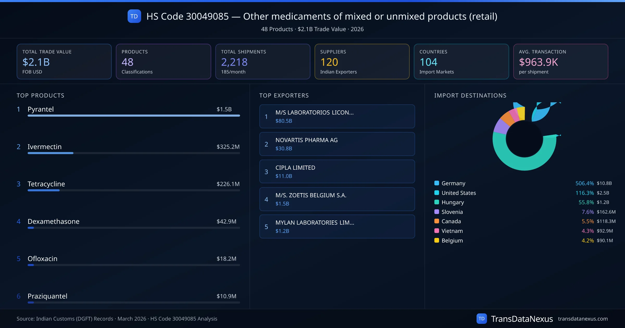 HS Code 30049085 (Other medicaments of mixed or unmixed products (retail)) is one of India's most significant pharmaceutical export classifications under Chapter 30 of the Harmonized System. With a total trade value of $2.1B across 2,218 shipments, this code covers 48 distinct pharmaceutical products exported by 120 Indian manufacturers to 104 countries. The leading product under this classification is Pyrantel at $1.5B, followed by Ivermectin and Tetracycline.
