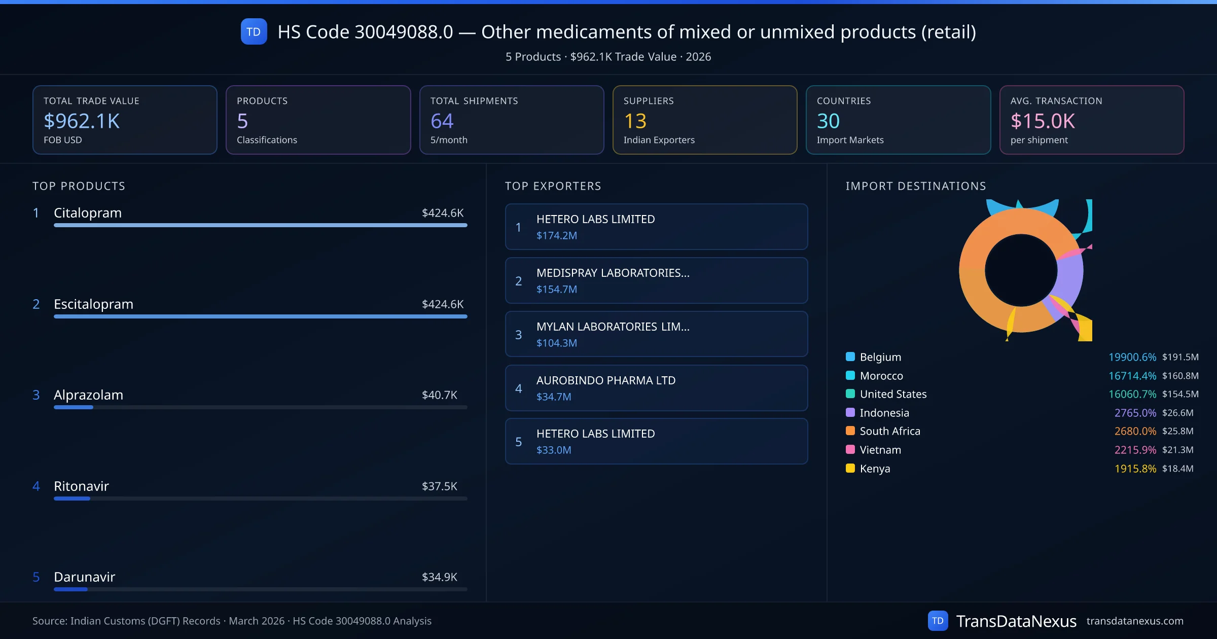 HS Code 30049088.0 (Other medicaments of mixed or unmixed products (retail)) is one of India's most significant pharmaceutical export classifications under Chapter 30 of the Harmonized System. With a total trade value of $962.1K across 64 shipments, this code covers 5 distinct pharmaceutical products exported by 13 Indian manufacturers to 30 countries. The leading product under this classification is Citalopram at $424.6K, followed by Escitalopram and Alprazolam.