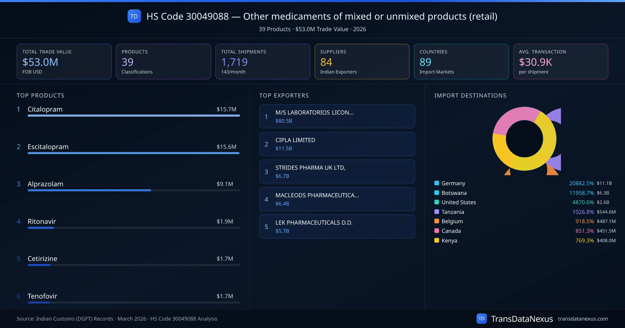 HS Code 30049088 (Other medicaments of mixed or unmixed products (retail)) is one of India's most significant pharmaceutical export classifications under Chapter 30 of the Harmonized System. With a total trade value of $53.0M across 1,719 shipments, this code covers 39 distinct pharmaceutical products exported by 84 Indian manufacturers to 89 countries. The leading product under this classification is Citalopram at $15.7M, followed by Escitalopram and Alprazolam.