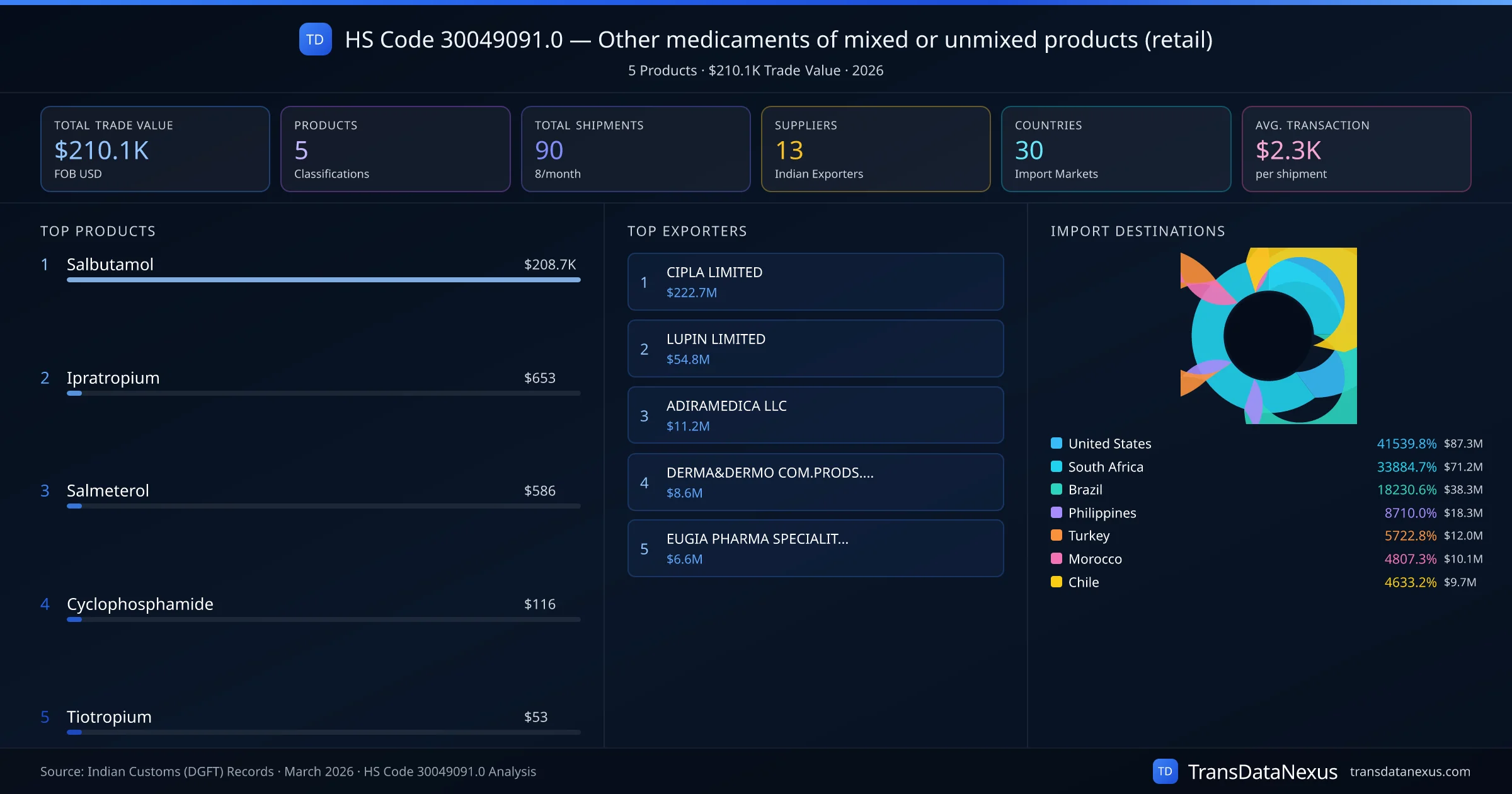 The top importing markets include United States, South Africa, Brazil. The top 5 products account for 100.0% of total trade under this code. Average transaction value is $2.3K. Leading exporters include CIPLA LIMITED and LUPIN LIMITED. Data sourced from Indian Customs (DGFT) shipping bill records.