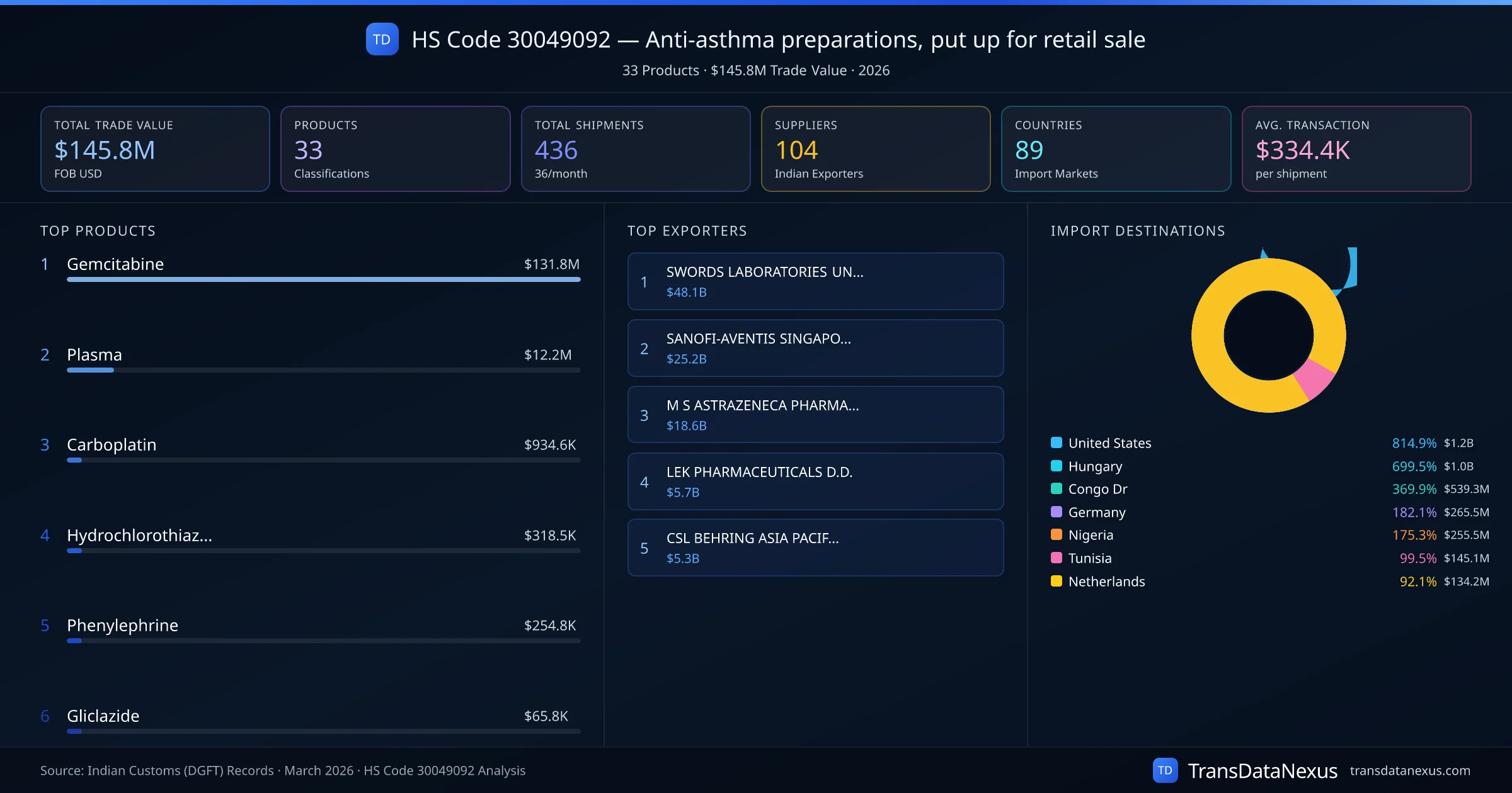 HS Code 30049092 (Anti-asthma preparations, put up for retail sale) is one of India's most significant pharmaceutical export classifications under Chapter 30 of the Harmonized System. With a total trade value of $145.8M across 436 shipments, this code covers 33 distinct pharmaceutical products exported by 104 Indian manufacturers to 89 countries. The leading product under this classification is Gemcitabine at $131.8M, followed by Plasma and Carboplatin.