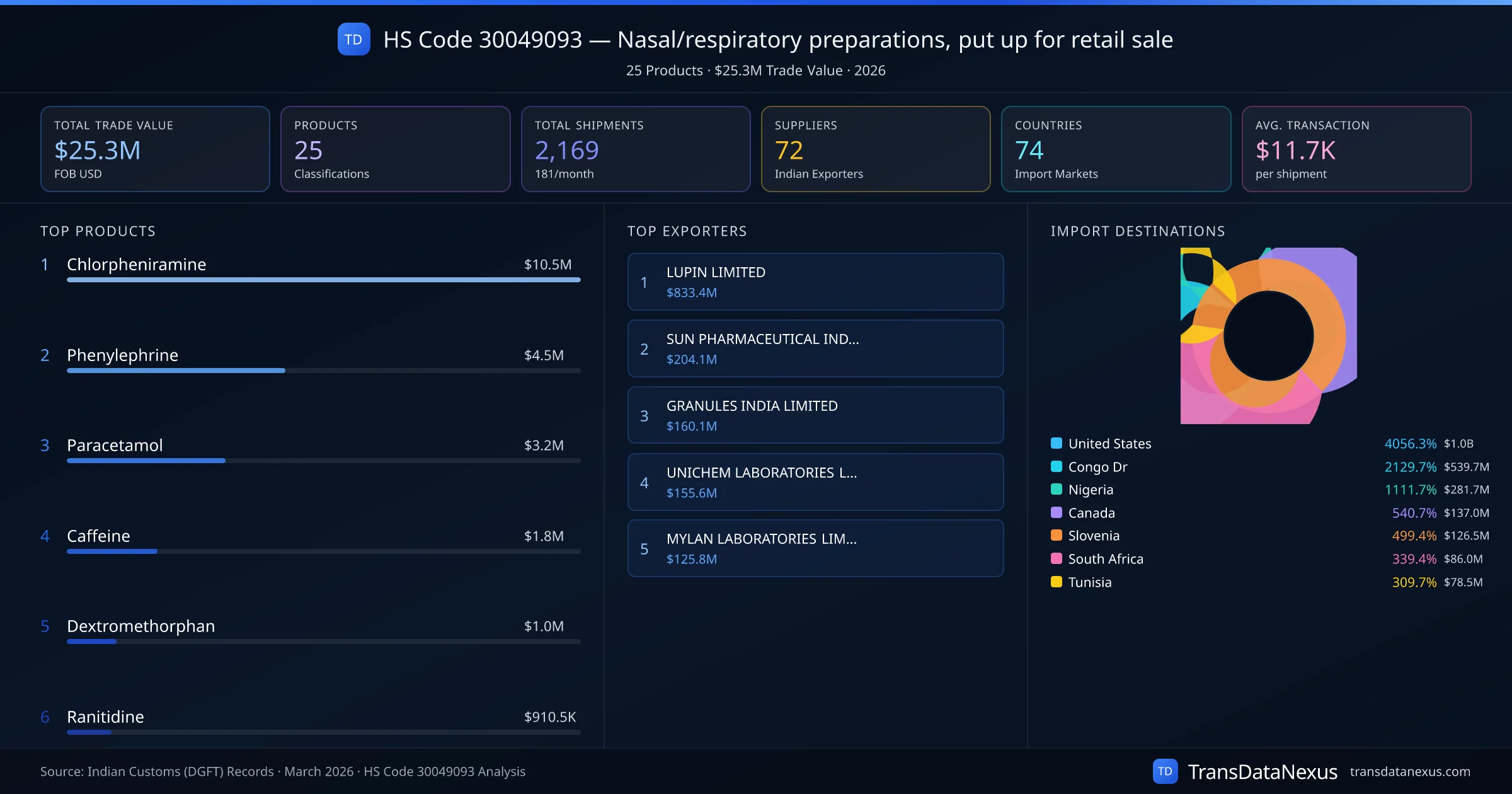 The top importing markets include United States, Congo Dr, Nigeria. The top 5 products account for 83.0% of total trade under this code. Average transaction value is $11.7K. Leading exporters include LUPIN LIMITED and SUN PHARMACEUTICAL INDUSTRIES LIMITED. Data sourced from Indian Customs (DGFT) shipping bill records.