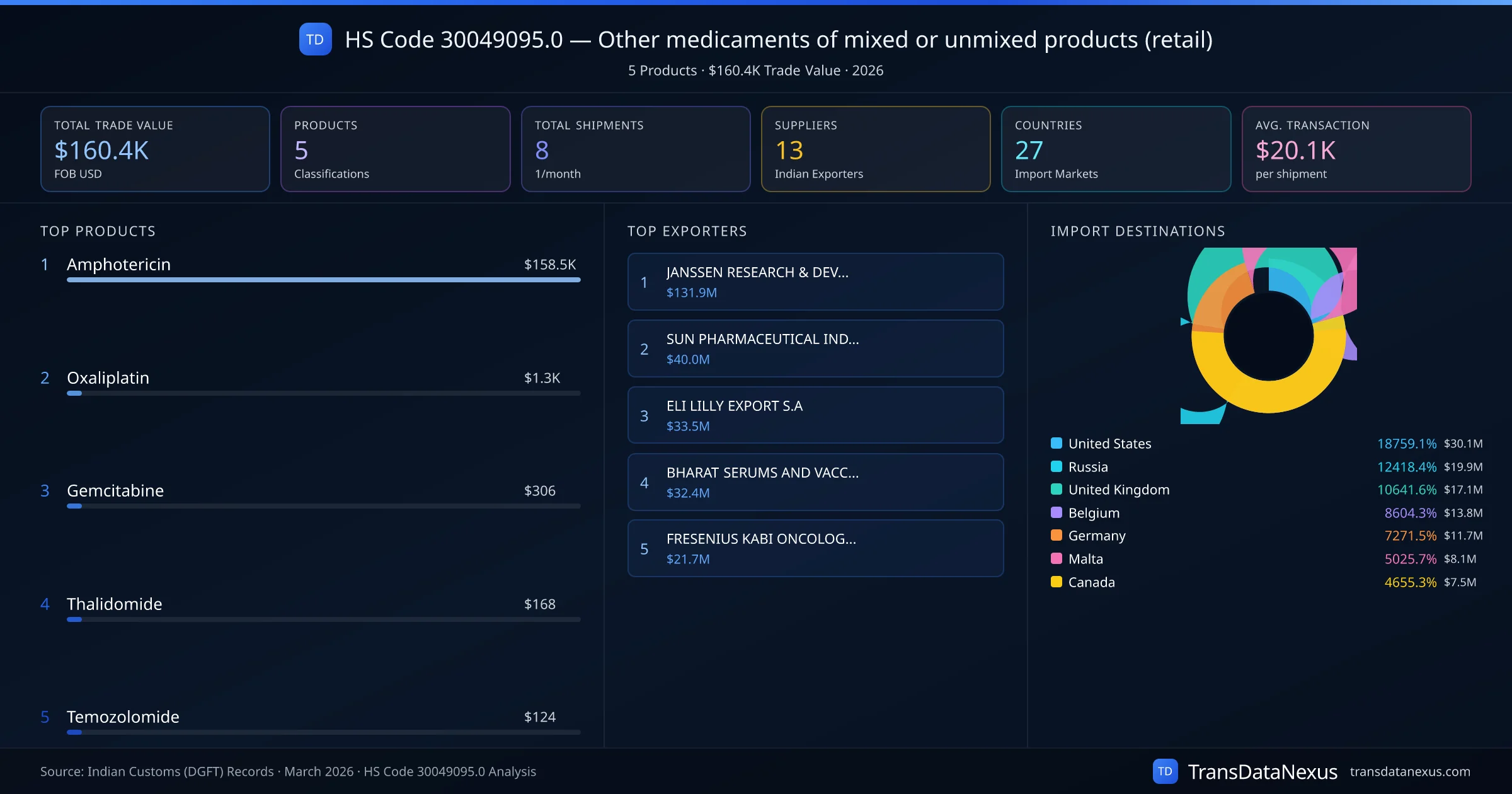HS Code 30049095.0 (Other medicaments of mixed or unmixed products (retail)) is one of India's most significant pharmaceutical export classifications under Chapter 30 of the Harmonized System. With a total trade value of $160.4K across 8 shipments, this code covers 5 distinct pharmaceutical products exported by 13 Indian manufacturers to 27 countries. The leading product under this classification is Amphotericin at $158.5K, followed by Oxaliplatin and Gemcitabine.