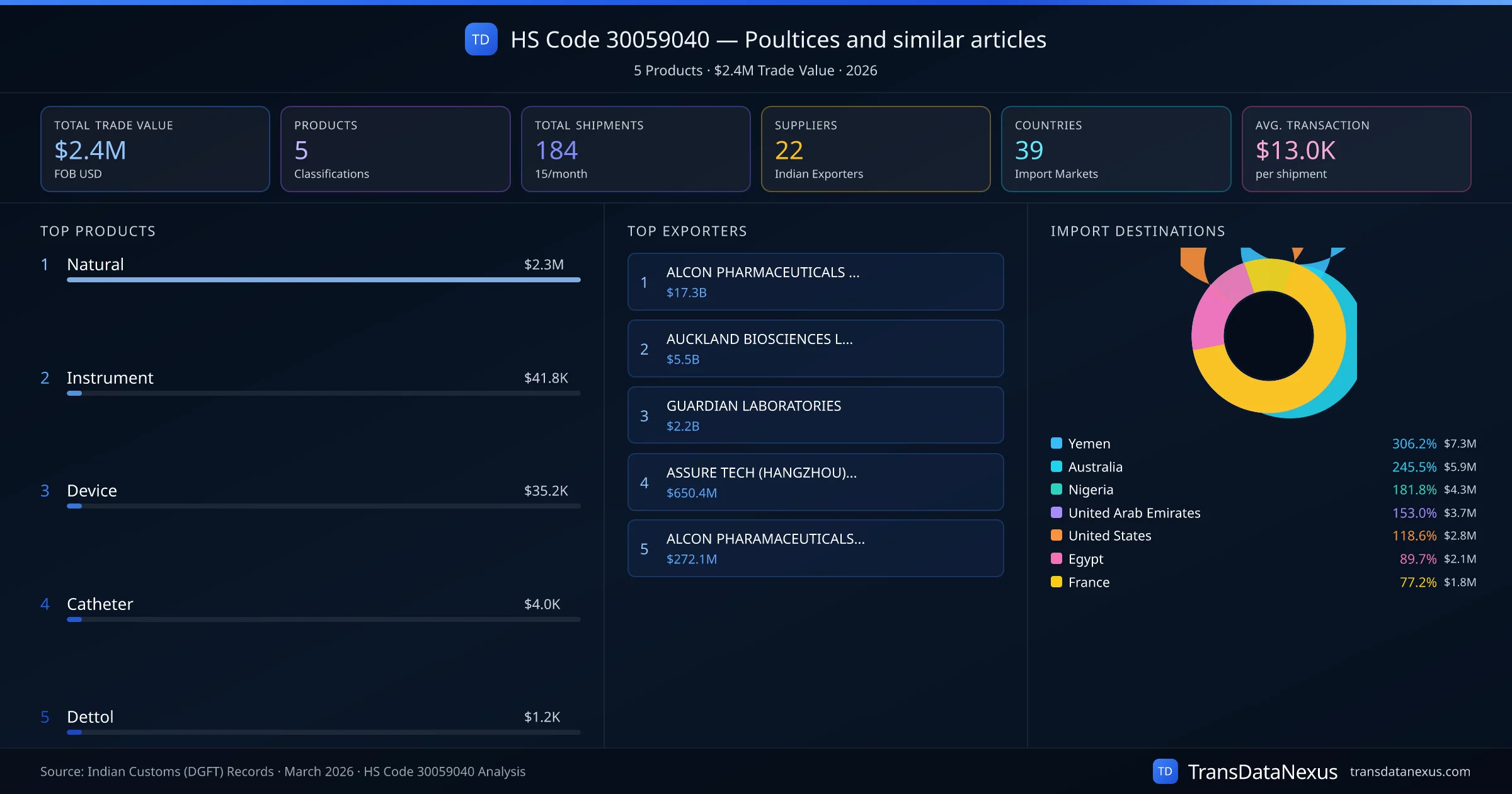 The top importing markets include Yemen, Australia, Nigeria. The top 5 products account for 100.0% of total trade under this code. Average transaction value is $13.0K. Leading exporters include ALCON PHARMACEUTICALS LTD and AUCKLAND BIOSCIENCES LIMITED.. Data sourced from Indian Customs (DGFT) shipping bill records.