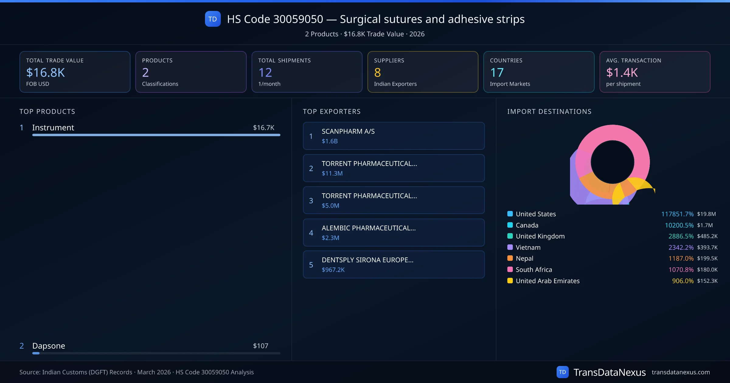 HS Code 30059050 (Surgical sutures and adhesive strips) is one of India's most significant pharmaceutical export classifications under Chapter 30 of the Harmonized System. With a total trade value of $16.8K across 12 shipments, this code covers 2 distinct pharmaceutical products exported by 8 Indian manufacturers to 17 countries. The leading product under this classification is Instrument at $16.7K, followed by Dapsone.