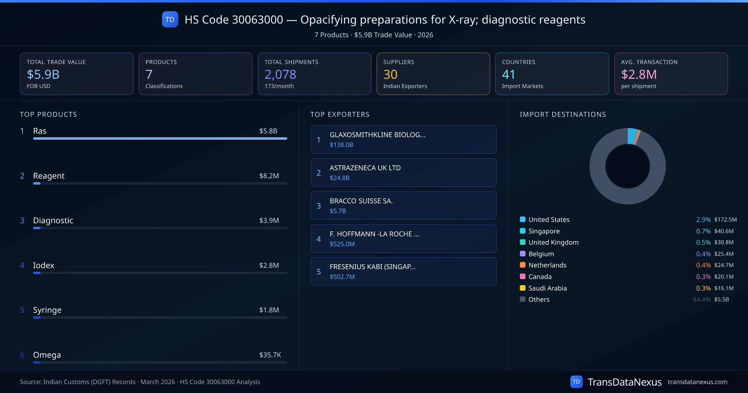HS Code 30063000 (Opacifying preparations for X-ray; diagnostic reagents) is one of India's most significant pharmaceutical export classifications under Chapter 30 of the Harmonized System. With a total trade value of $5.9B across 2,078 shipments, this code covers 7 distinct pharmaceutical products exported by 30 Indian manufacturers to 41 countries. The leading product under this classification is Ras at $5.8B, followed by Reagent and Diagnostic.