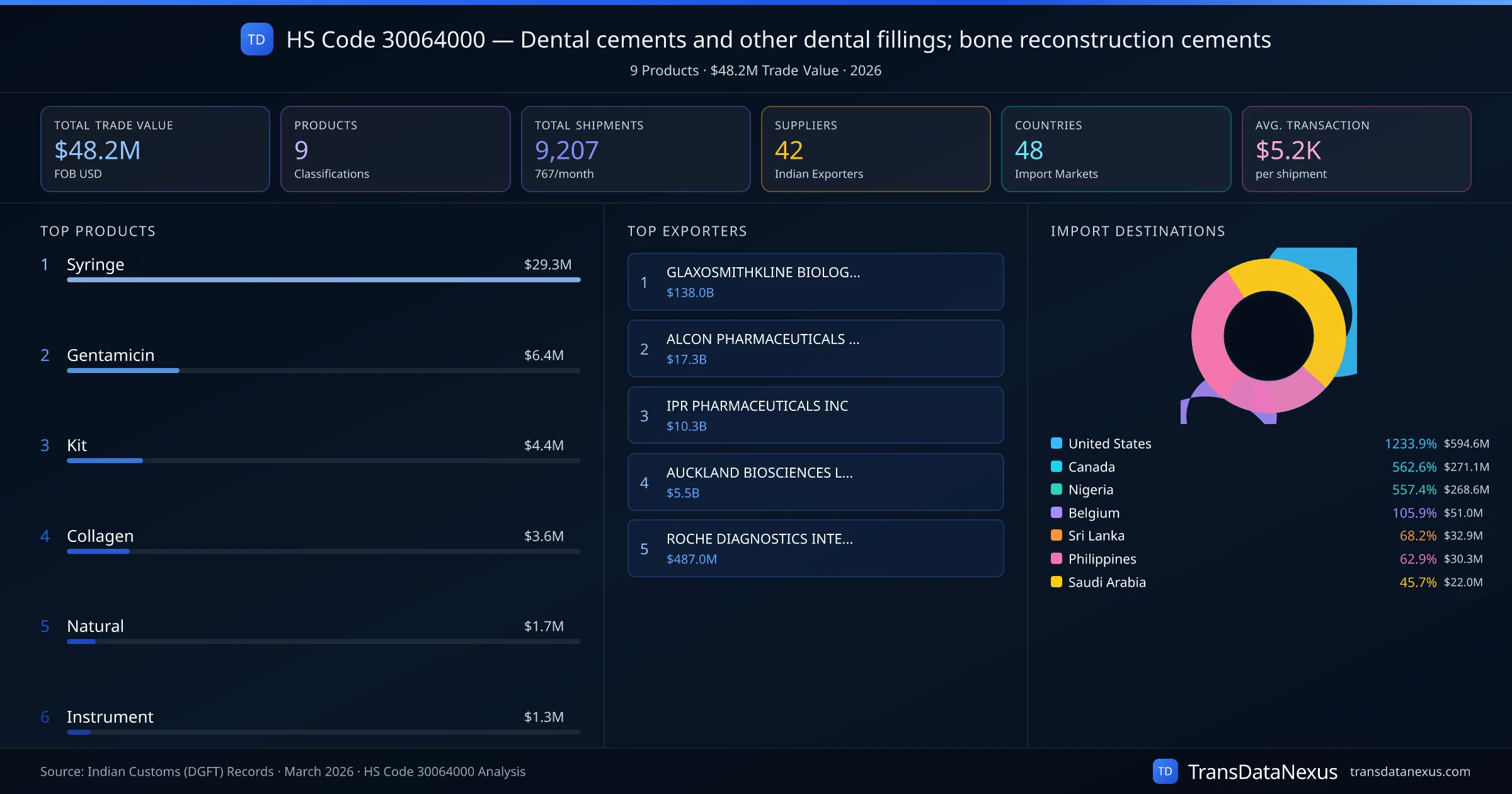 HS Code 30064000 (Dental cements and other dental fillings; bone reconstruction cements) is one of India's most significant pharmaceutical export classifications under Chapter 30 of the Harmonized System. With a total trade value of $48.2M across 9,207 shipments, this code covers 9 distinct pharmaceutical products exported by 42 Indian manufacturers to 48 countries. The leading product under this classification is Syringe at $29.3M, followed by Gentamicin and Kit.