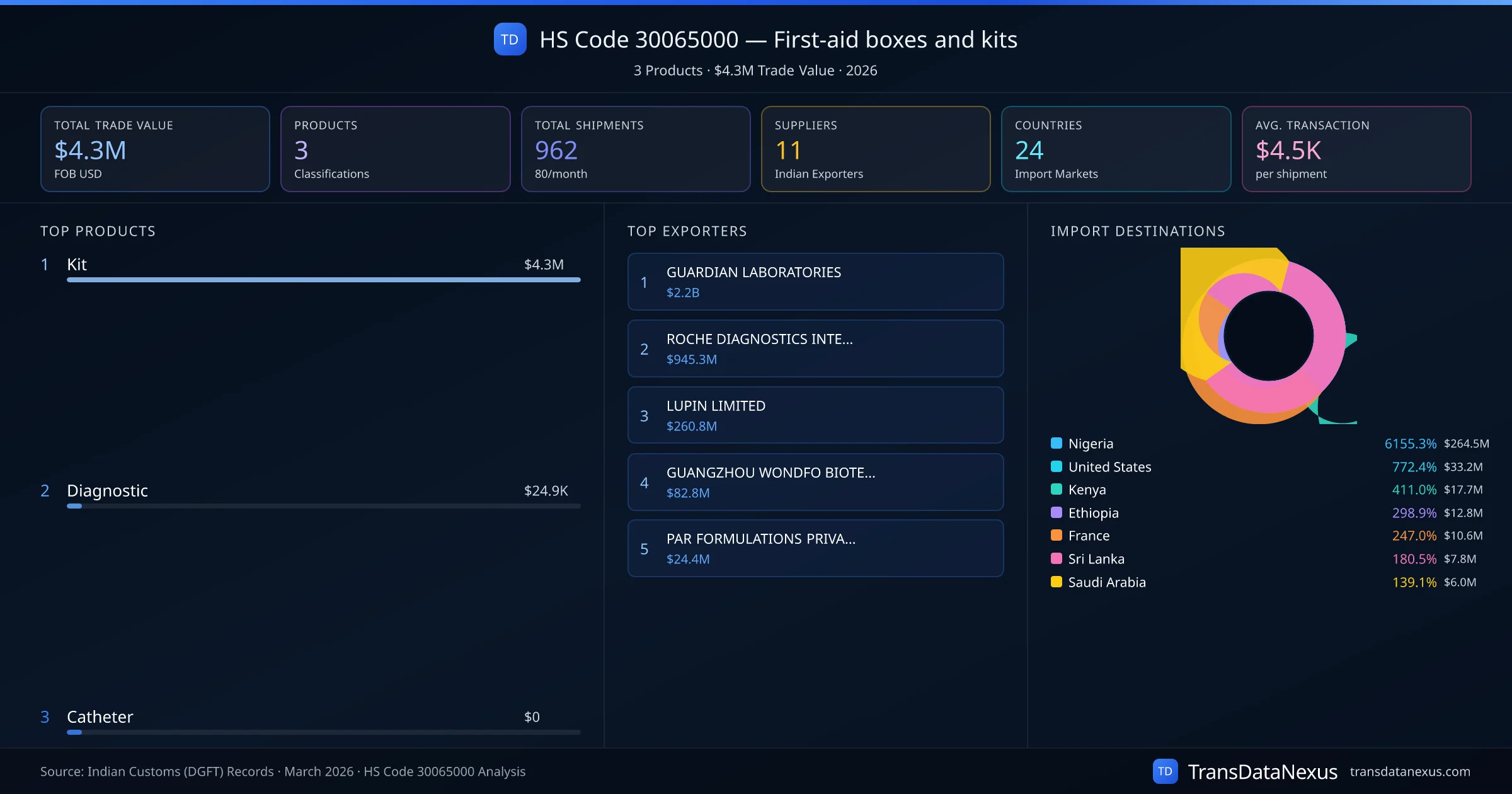 HS Code 30065000 (First-aid boxes and kits) is one of India's most significant pharmaceutical export classifications under Chapter 30 of the Harmonized System. With a total trade value of $4.3M across 962 shipments, this code covers 3 distinct pharmaceutical products exported by 11 Indian manufacturers to 24 countries. The leading product under this classification is Kit at $4.3M, followed by Diagnostic and Catheter.