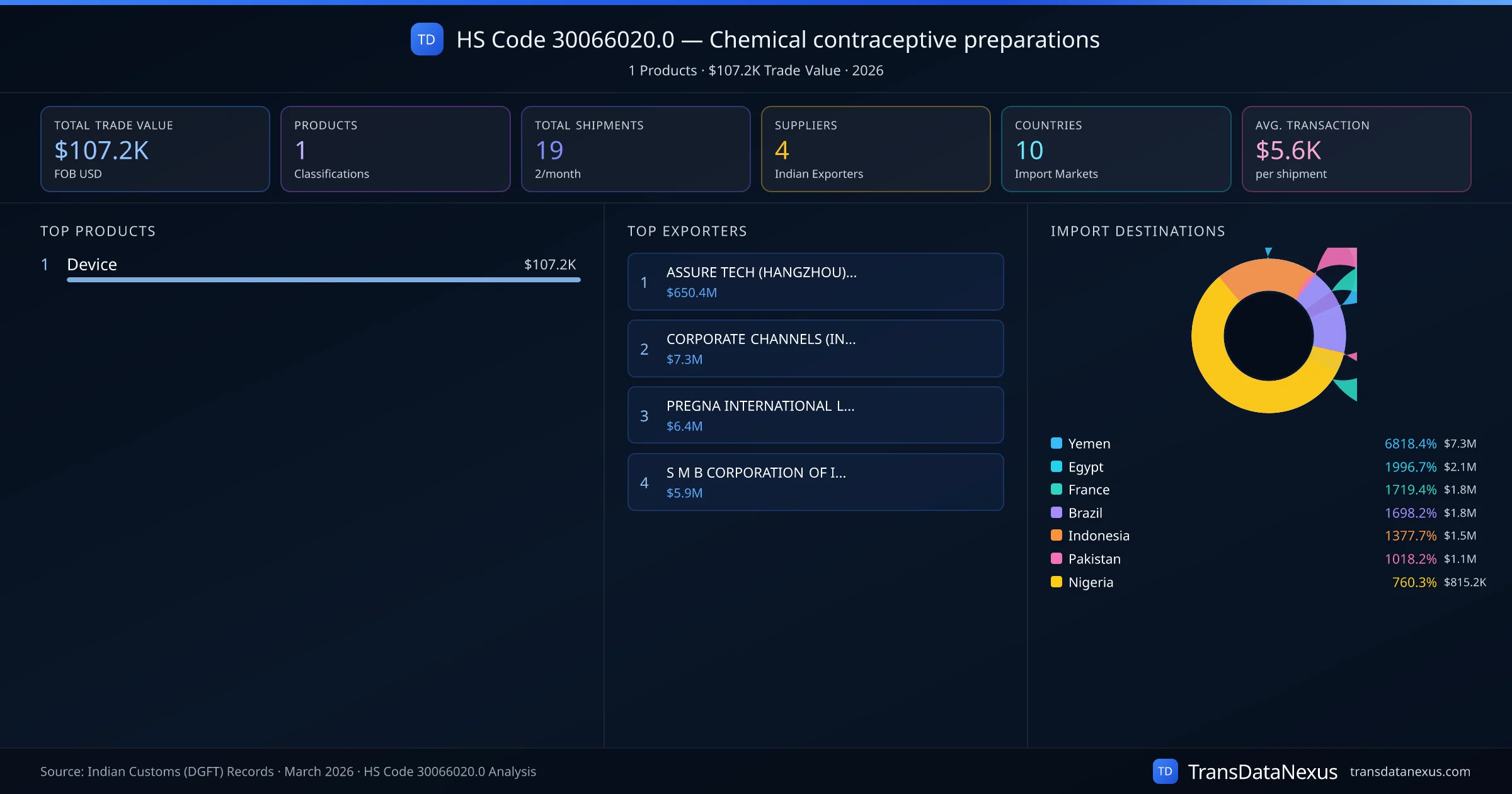 HS Code 30066020.0 (Chemical contraceptive preparations) is one of India's most significant pharmaceutical export classifications under Chapter 30 of the Harmonized System. With a total trade value of $107.2K across 19 shipments, this code covers 1 distinct pharmaceutical products exported by 4 Indian manufacturers to 10 countries. The leading product under this classification is Device at $107.2K, followed by .