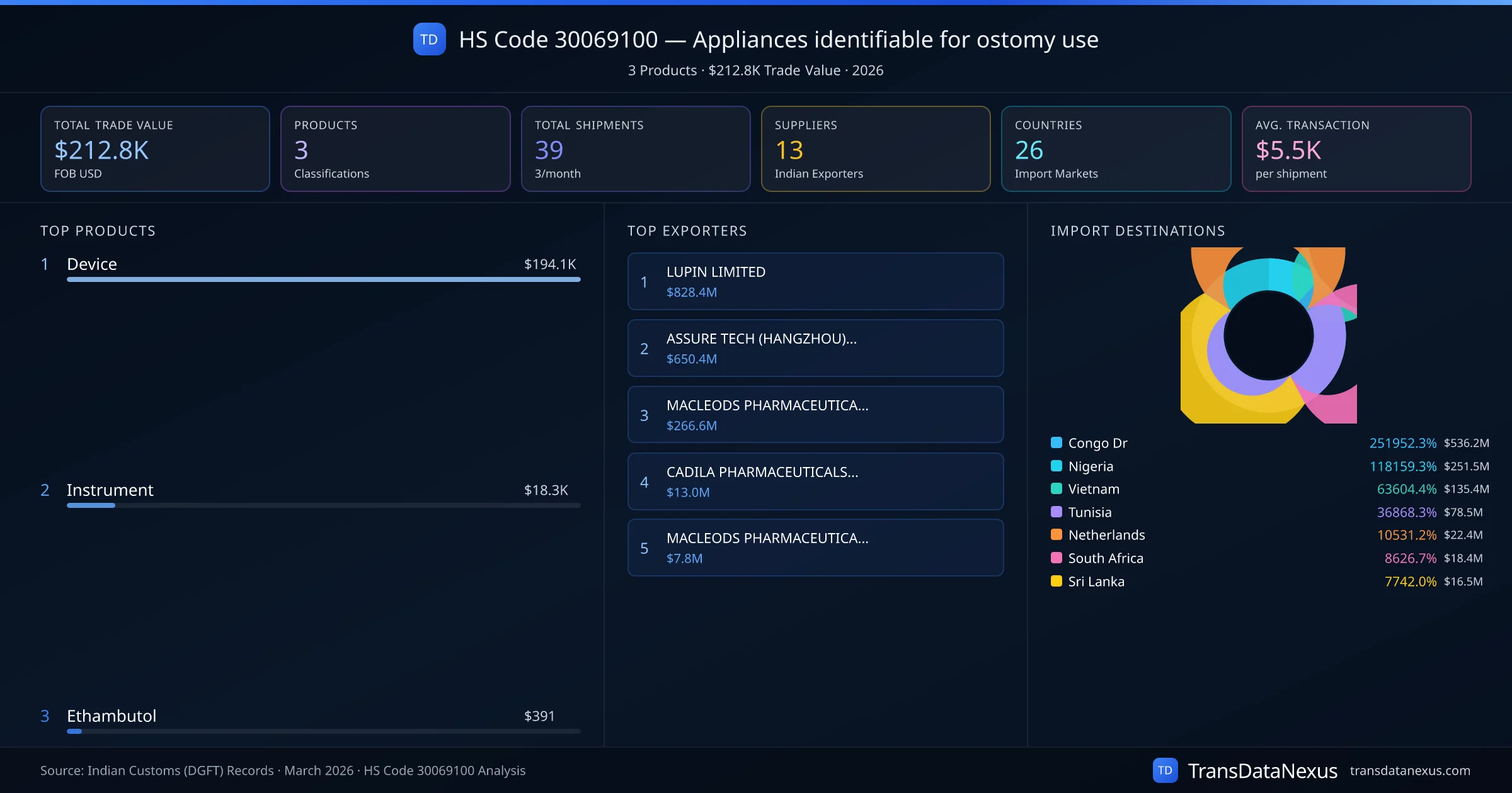 HS Code 30069100 (Appliances identifiable for ostomy use) is one of India's most significant pharmaceutical export classifications under Chapter 30 of the Harmonized System. With a total trade value of $212.8K across 39 shipments, this code covers 3 distinct pharmaceutical products exported by 13 Indian manufacturers to 26 countries. The leading product under this classification is Device at $194.1K, followed by Instrument and Ethambutol.