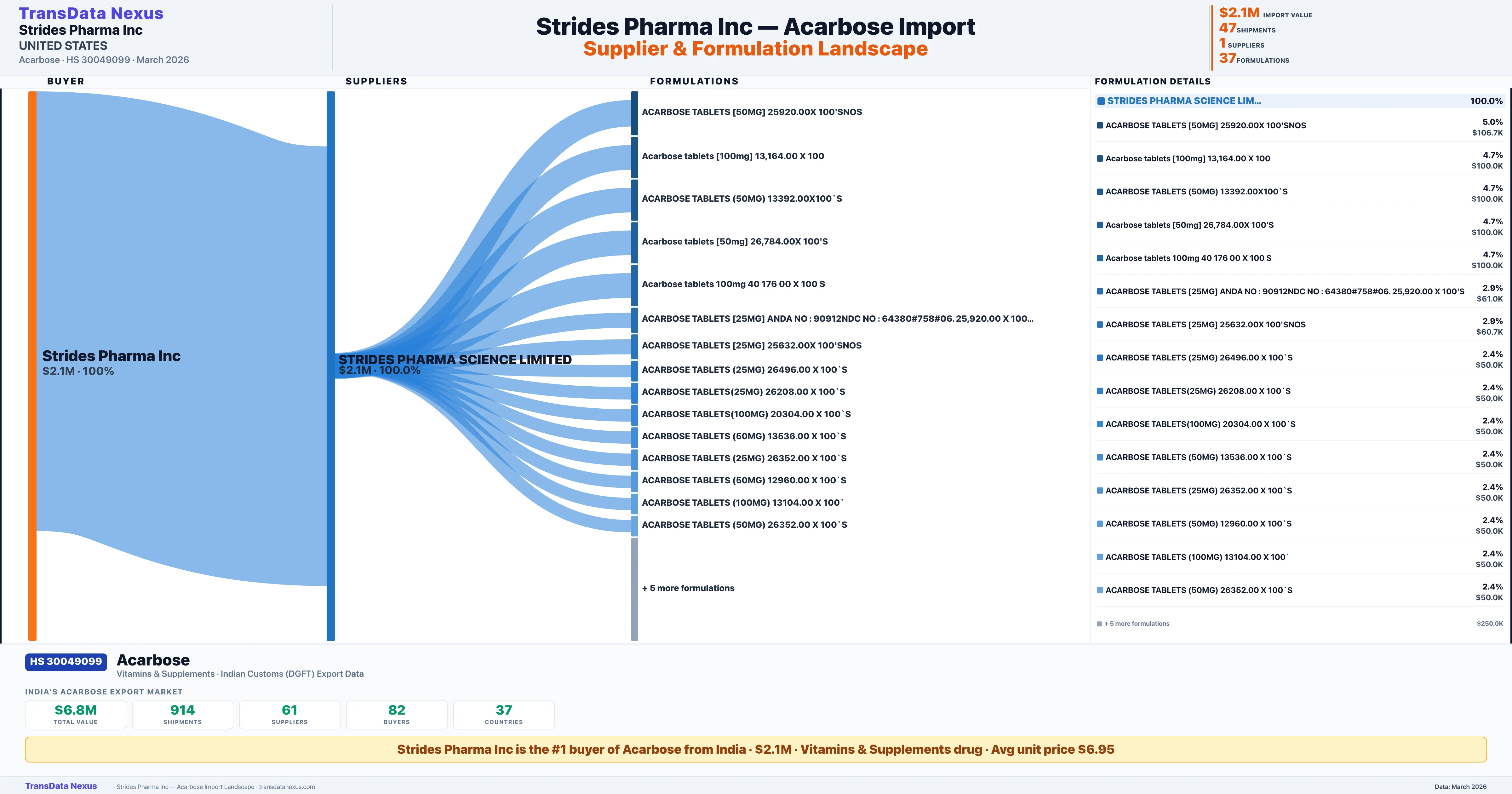 STRIDES PHARMA INC imports 37 distinct Acarbose formulations from India. The top formulation is ACARBOSE TABLETS [50MG] 25920.00X 100'SNOS with 3 shipments worth $106.7K.