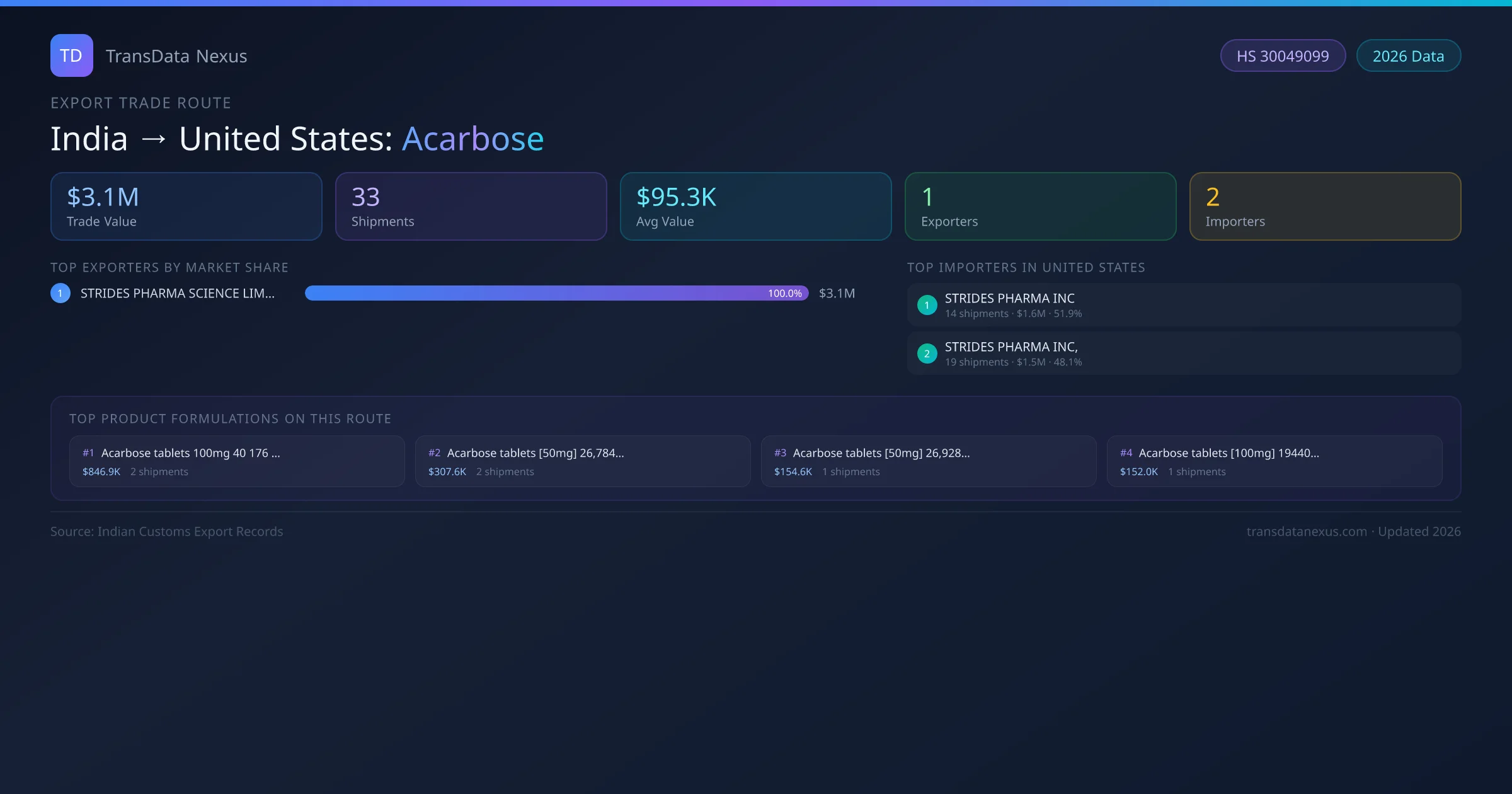 On the receiving end of this trade route, the leading importers of Indian acarbose in United States include STRIDES PHARMA INC, STRIDES PHARMA INC,. The largest importer is STRIDES PHARMA INC, accounting for $1.6M USD across 14 shipments — representing 52% of all acarbose imports from India on this route.
