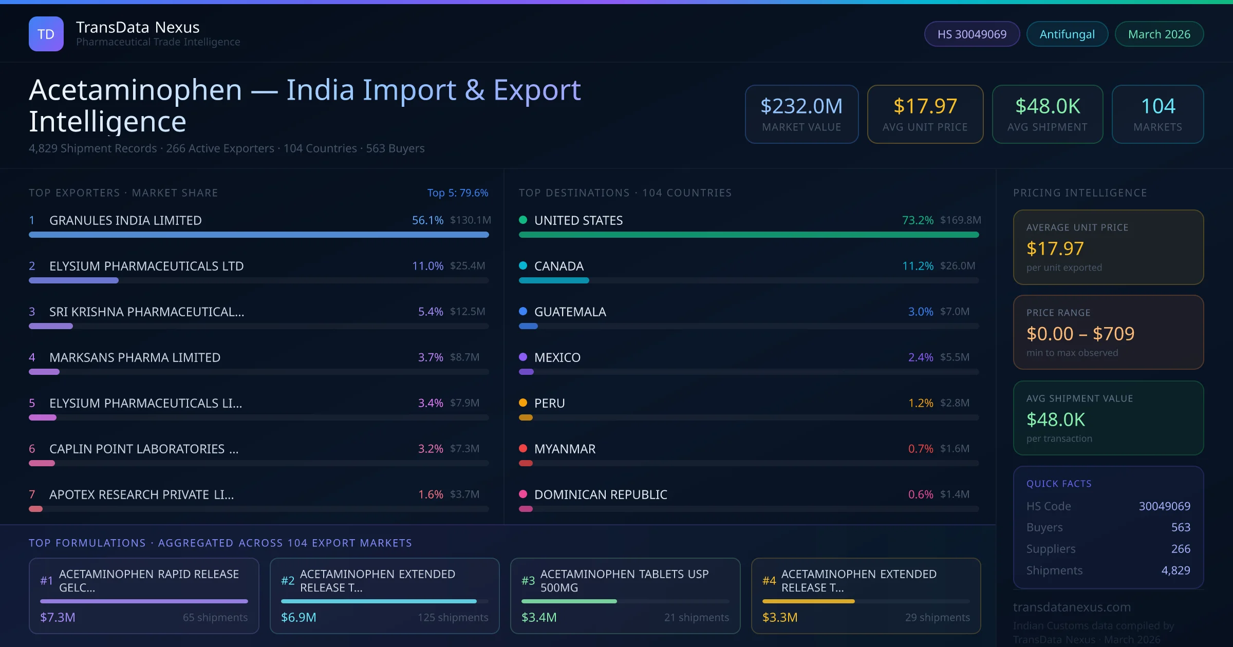The total export value of acetaminophen from India is $232.0M, recorded across 4,829 shipments from 266 active exporters to 104 countries. The average shipment value is $48.0K.