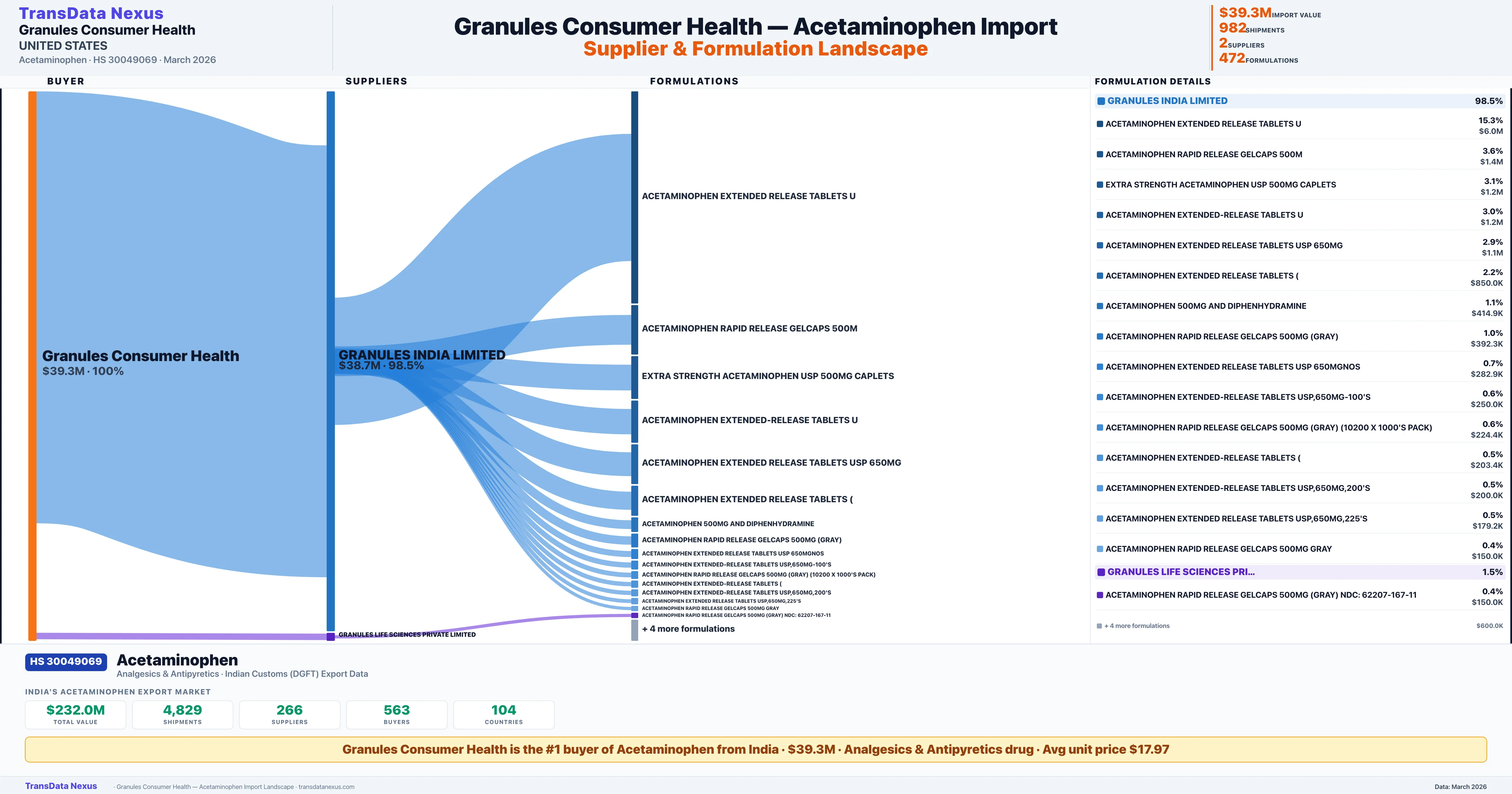 GRANULES CONSUMER HEALTH sources Acetaminophen from 2 verified Indian suppliers: GRANULES INDIA LIMITED ($38.7M, 98.5%), GRANULES LIFE SCIENCES PRIVATE LIMITED ($578.0K, 1.5%). This is based on 982 customs records.