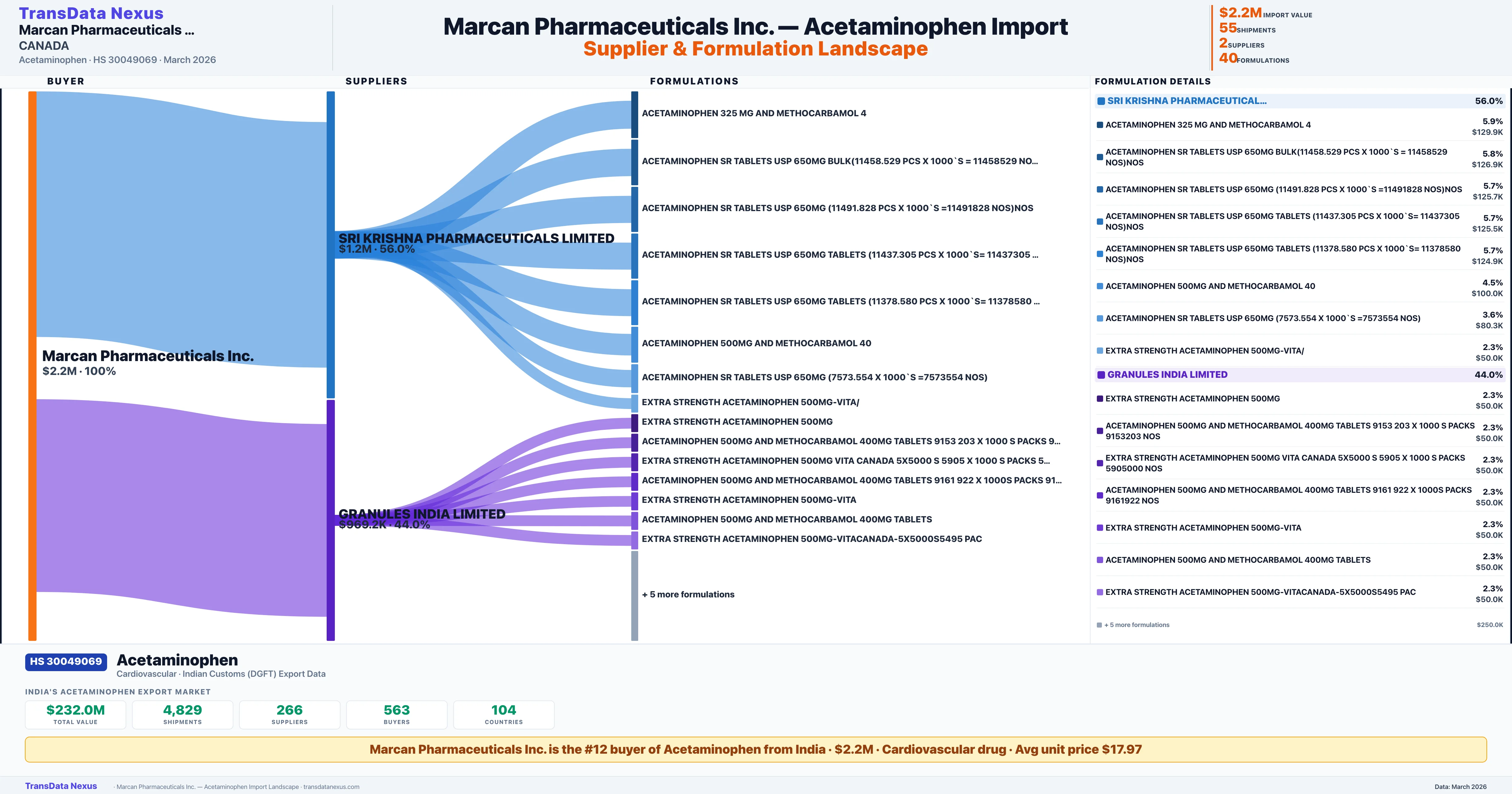 MARCAN PHARMACEUTICALS INC sources Acetaminophen from 2 verified Indian suppliers: SRI KRISHNA PHARMACEUTICALS LIMITED ($1.2M, 56.0%), GRANULES INDIA LIMITED ($969.2K, 44.0%). This is based on 55 customs records.