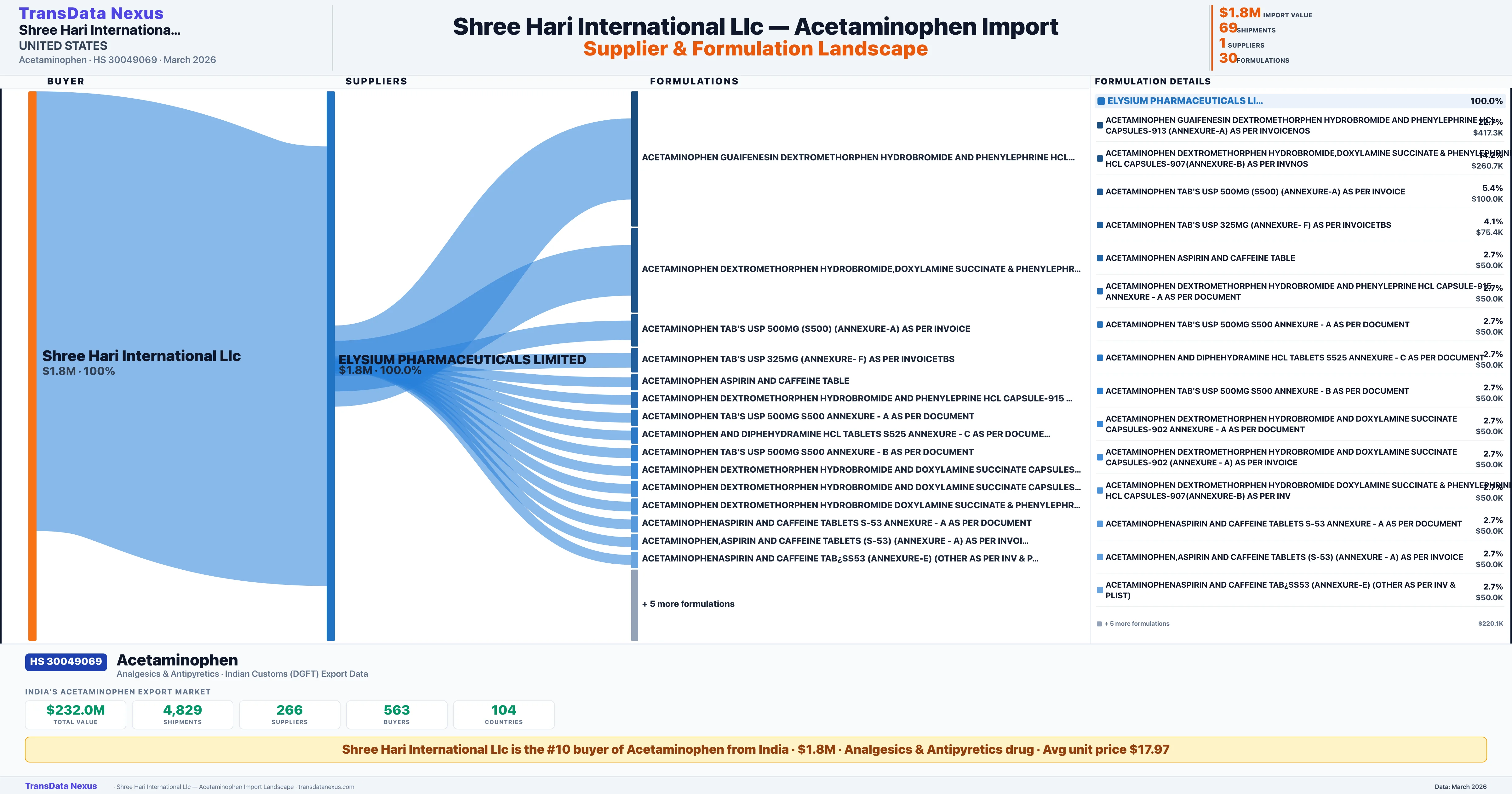 SHREE HARI INTERNATIONAL LLC sources Acetaminophen from 1 verified Indian supplier: ELYSIUM PHARMACEUTICALS LIMITED ($1.8M, 100.0%). This is based on 69 customs records.