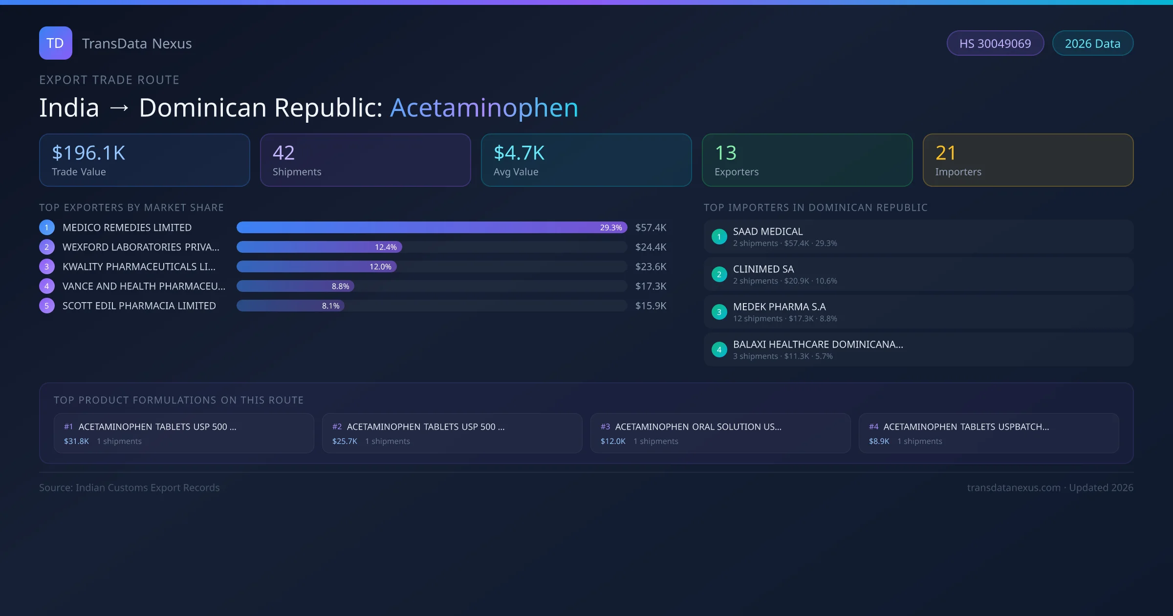 The India to Dominican Republic Acetaminophen corridor is one of India's established pharmaceutical export routes, with 42 shipments documented worth a combined $196.1K USD. The route is dominated by MEDICO REMEDIES LIMITED, which alone accounts for roughly 29% of all export value, reflecting the consolidated nature of India's acetaminophen manufacturing sector.