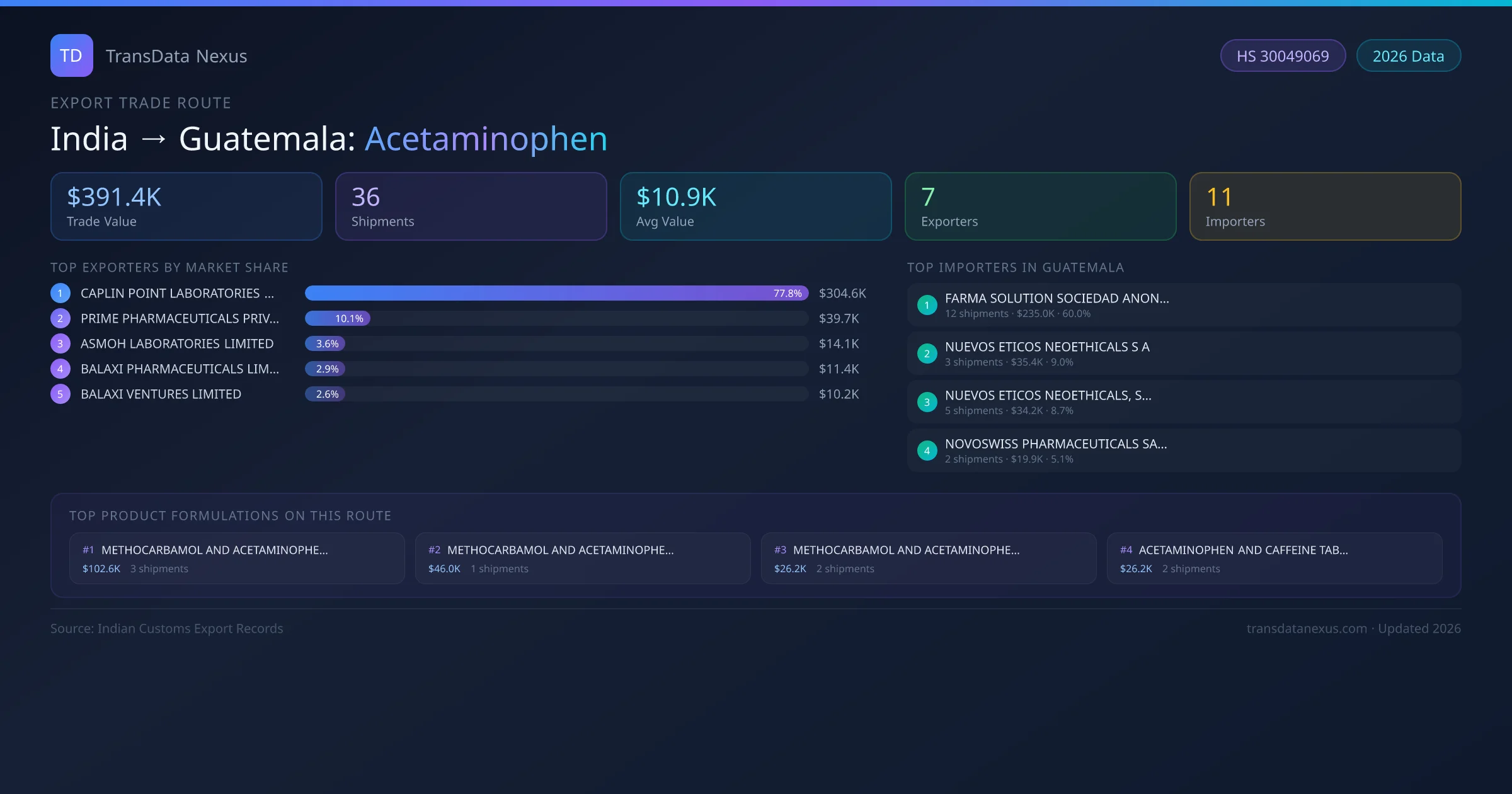 The India to Guatemala Acetaminophen corridor is one of India's established pharmaceutical export routes, with 36 shipments documented worth a combined $391.4K USD. The route is dominated by CAPLIN POINT LABORATORIES LIMITED, which alone accounts for roughly 78% of all export value, reflecting the consolidated nature of India's acetaminophen manufacturing sector.