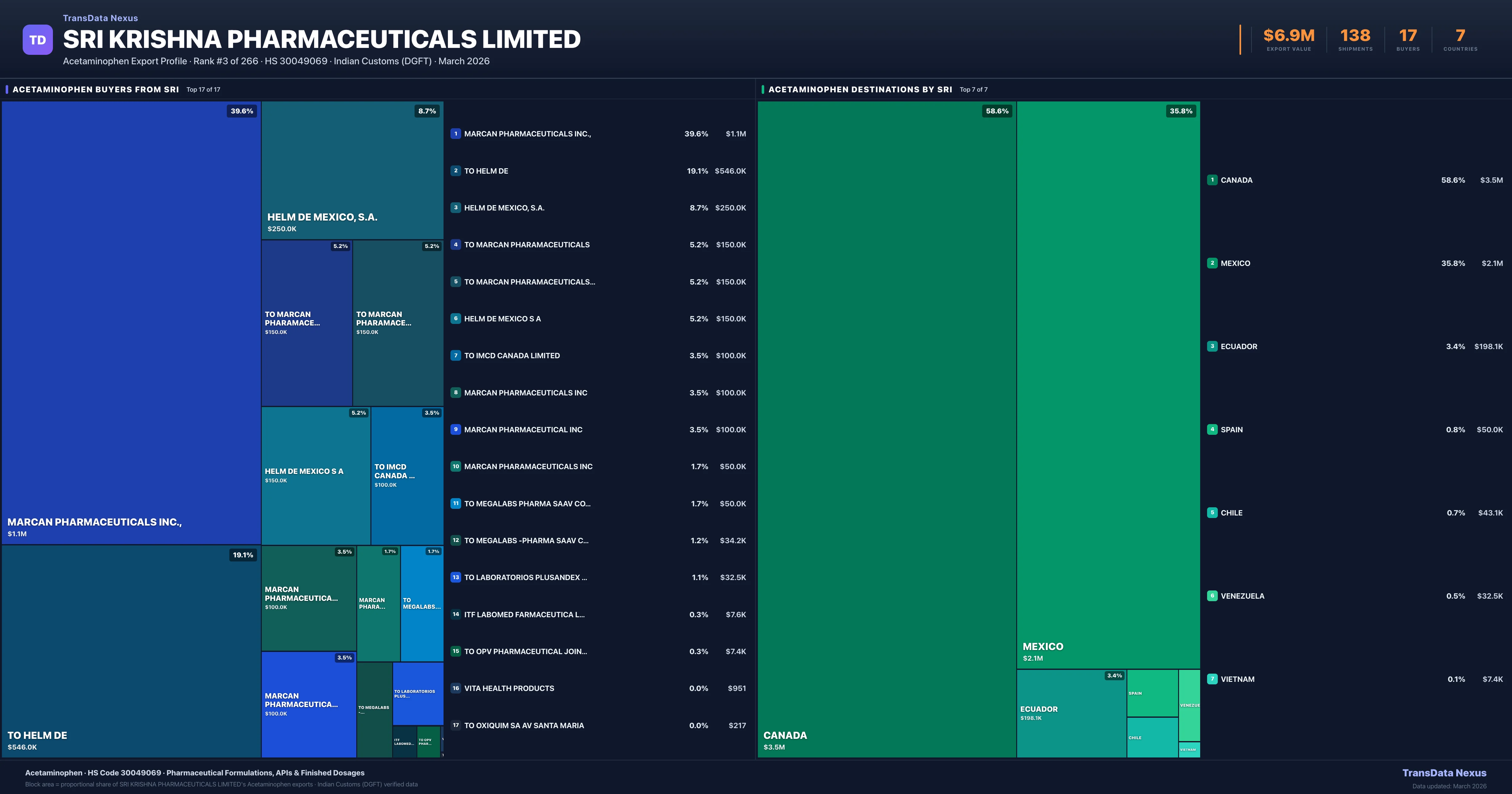 SRI Krishna Pharmaceuticals Limited supplies Acetaminophen to 17 buyers globally. The largest buyer is MARCAN PHARMACEUTICALS INC., (CANADA), followed by TO HELM DE (MEXICO) and HELM DE MEXICO, S.A. (MEXICO). These buyers represent pharmaceutical distributors, hospital groups, and government procurement agencies in their respective markets.