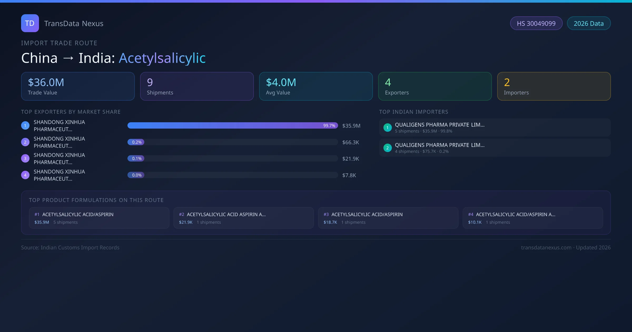 India has recorded 9 verified shipments of Acetylsalicylic imported from China, representing a combined trade value of $36.0M USD. This corridor is served by 4 active China exporters, with an average shipment value of $4.0M USD. The leading China supplier is SHANDONG XINHUA PHARMACEUTICAL CO., LTD. , which accounts for 100% of total import value with 3 shipments worth $35.9M USD. On the buying side, QUALIGENS PHARMA PRIVATE LIMITED is the largest Indian importer with $35.9M USD in purchases. The top 3 suppliers — SHANDONG XINHUA PHARMACEUTICAL CO., LTD. , SHANDONG XINHUA PHARMACEUTICAL CO., LTD., SHANDONG XINHUA PHARMACEUTICAL CO LTD — together control 100% of total trade value on this route. All data sourced from Indian Customs (DGFT) shipping bill of entry records. Values reported in FOB USD.