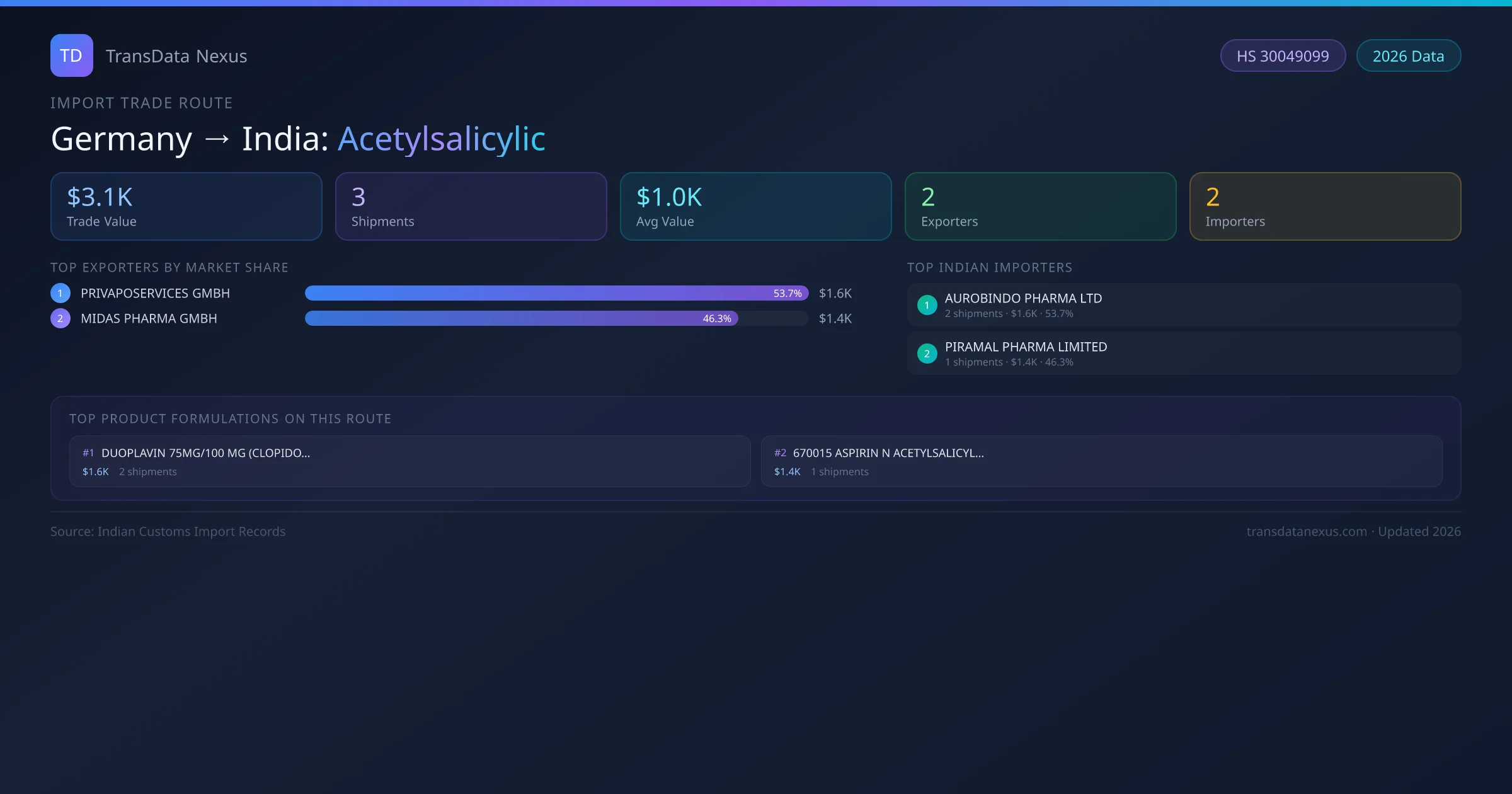 On the buying side, AUROBINDO PHARMA LTD is the largest importer with 2 shipments worth $1.6K USD — representing 54% of all acetylsalicylic imports from Germany on this route.