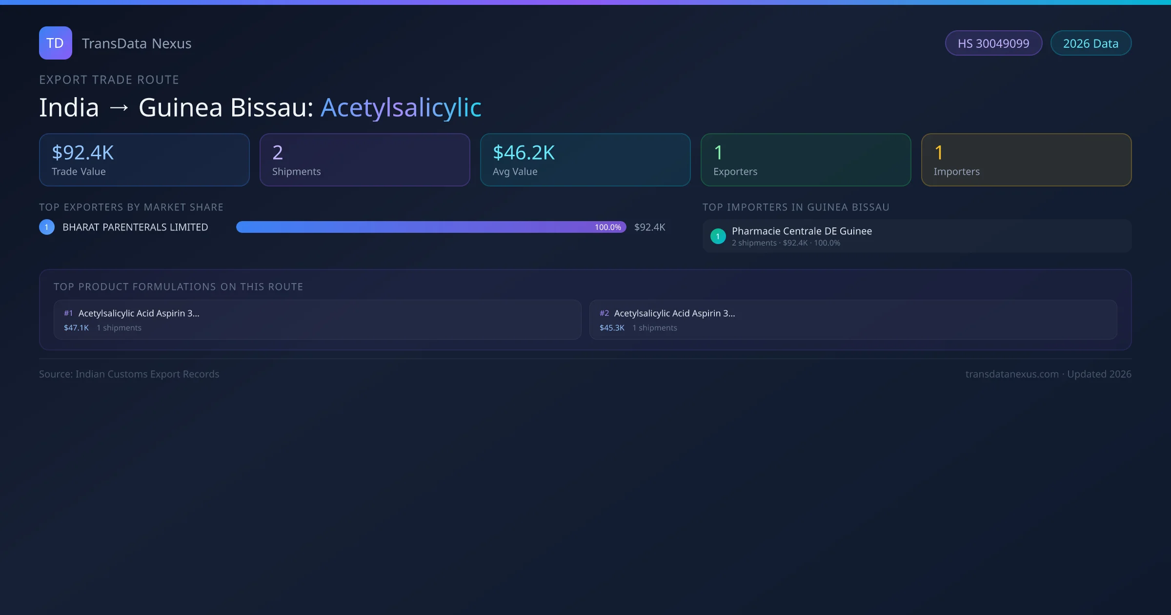 The India to Guinea Bissau Acetylsalicylic corridor is one of India's established pharmaceutical export routes, with 2 shipments documented worth a combined $92.4K USD. The route is dominated by BHARAT PARENTERALS LIMITED, which alone accounts for roughly 100% of all export value, reflecting the consolidated nature of India's acetylsalicylic manufacturing sector.