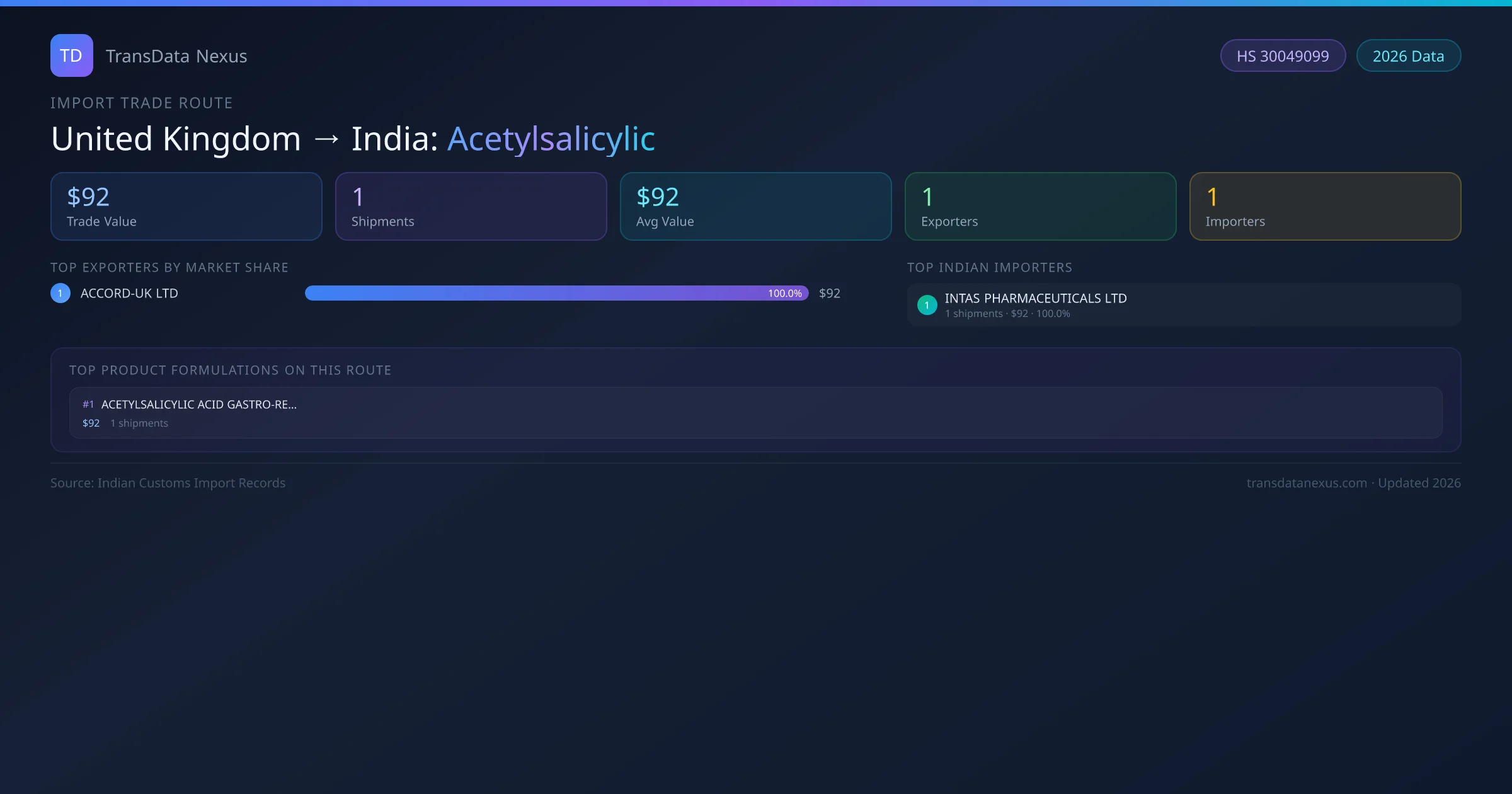 On the buying side, INTAS PHARMACEUTICALS LTD is the largest importer with 1 shipments worth $92 USD — representing 100% of all acetylsalicylic imports from United Kingdom on this route.