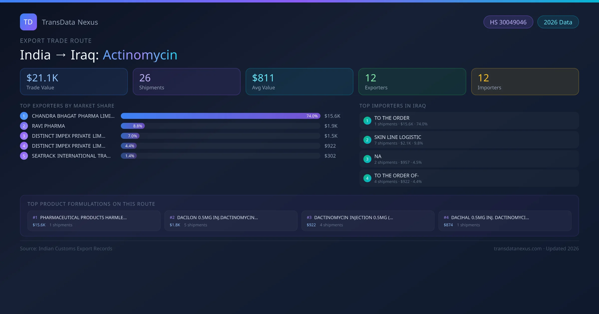 India exports Actinomycin to Iraq worth approximately $21.1K USD across 26 recorded shipments. The average value per shipment is $811 USD.