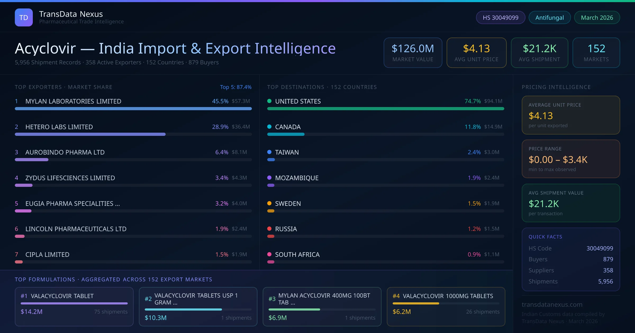 Between 2022 and 2026, India exported $126.0M worth of acyclovir across 5,956 verified shipments to 152 countries — covering 78% of world markets in the Antivirals segment. The largest destination is UNITED STATES (74.7%). MYLAN LABORATORIES LIMITED leads with a 45.5% share. All figures are drawn from Indian Customs (DGFT) shipping bill records spanning four years of trade activity.