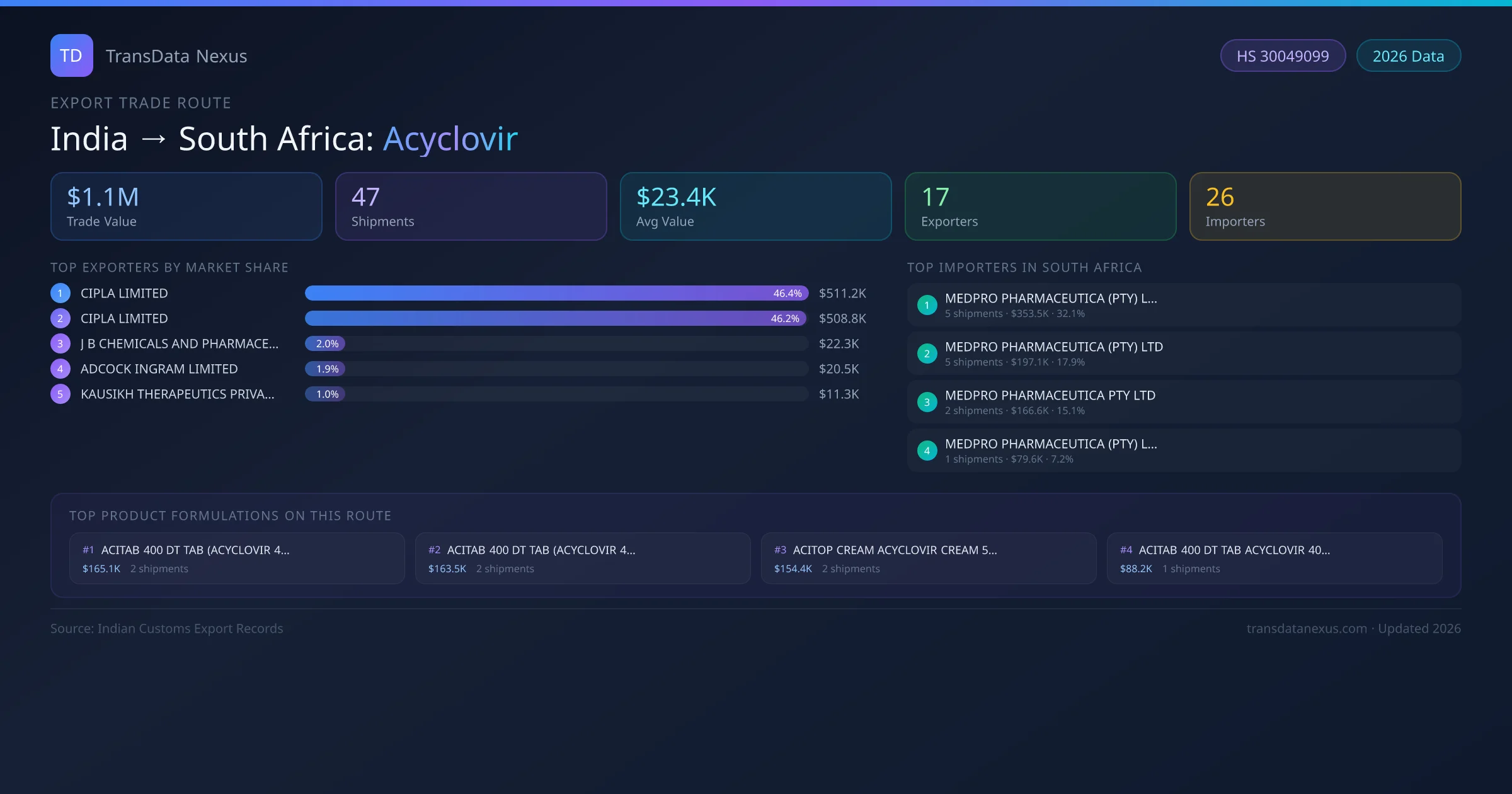 - 1.Route Identification: India to South Africa export trade corridor identified from Indian Customs (DGFT) records for Acyclovir.